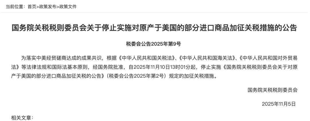 为落实中美经贸磋商达成的成果共识,根据《中华人民共和国关税法》、《中华人民共和国海关法》、《中华人民共和国对外贸易法》等法律法规和国际法基本原则,经国务院批准,自2025年11月10日13时01分起,调整《国务院关税税则委员会关于对原产于美国的进口商品加征关税的公告》(税委会公告2025年第4号)规定的加征关税措施,在一年内继续暂停实施24%的对美加征关税税率,保留10%的对美加征关税税率。