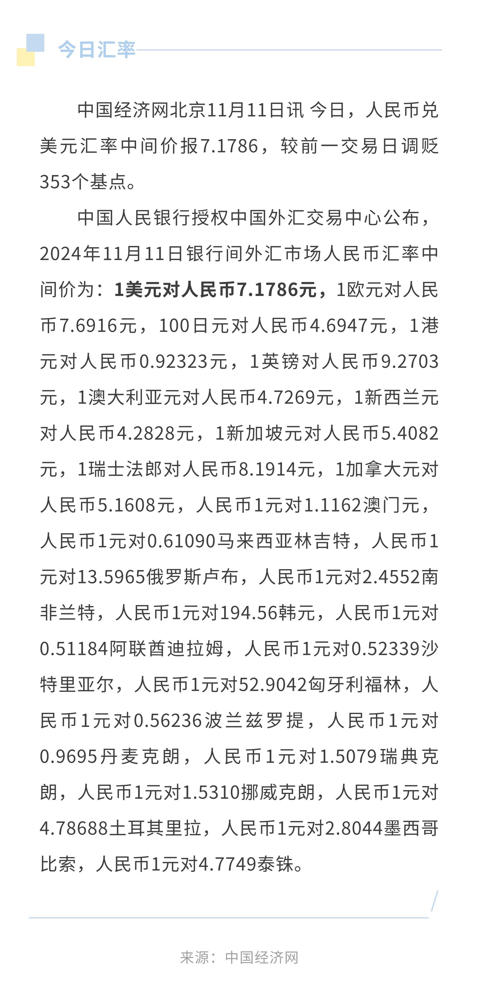 11月11日人民币兑美元中间价报7.1786,调贬353个基点