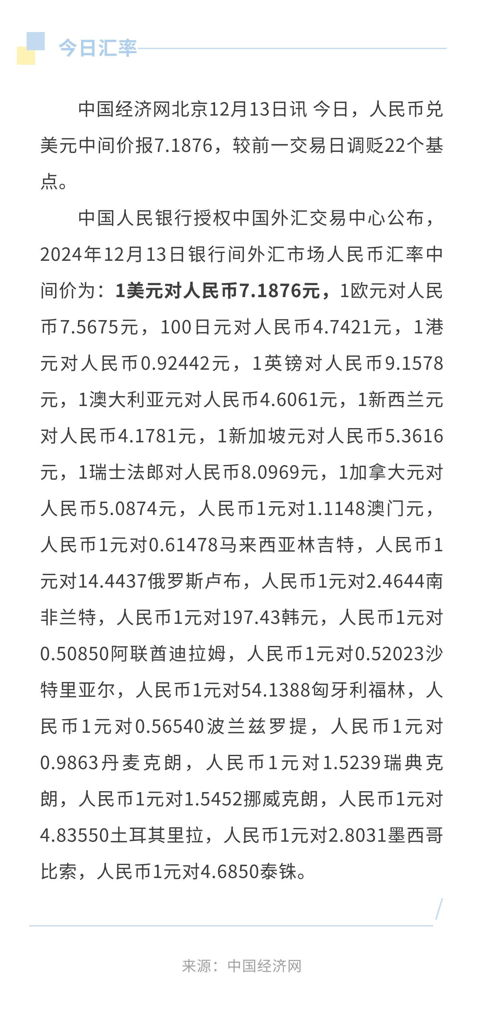 12月13日人民币兑美元中间价报7.1876,调贬22个基点