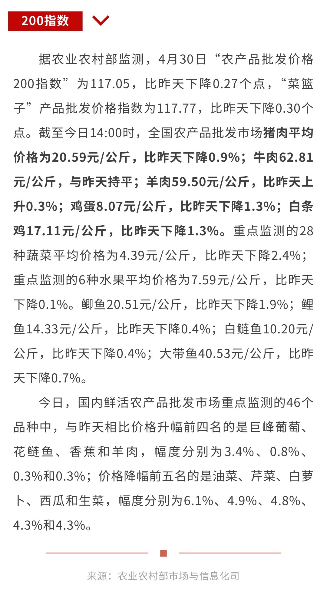 4月30日“农产品批发价格200指数”比昨天下降0.27个点