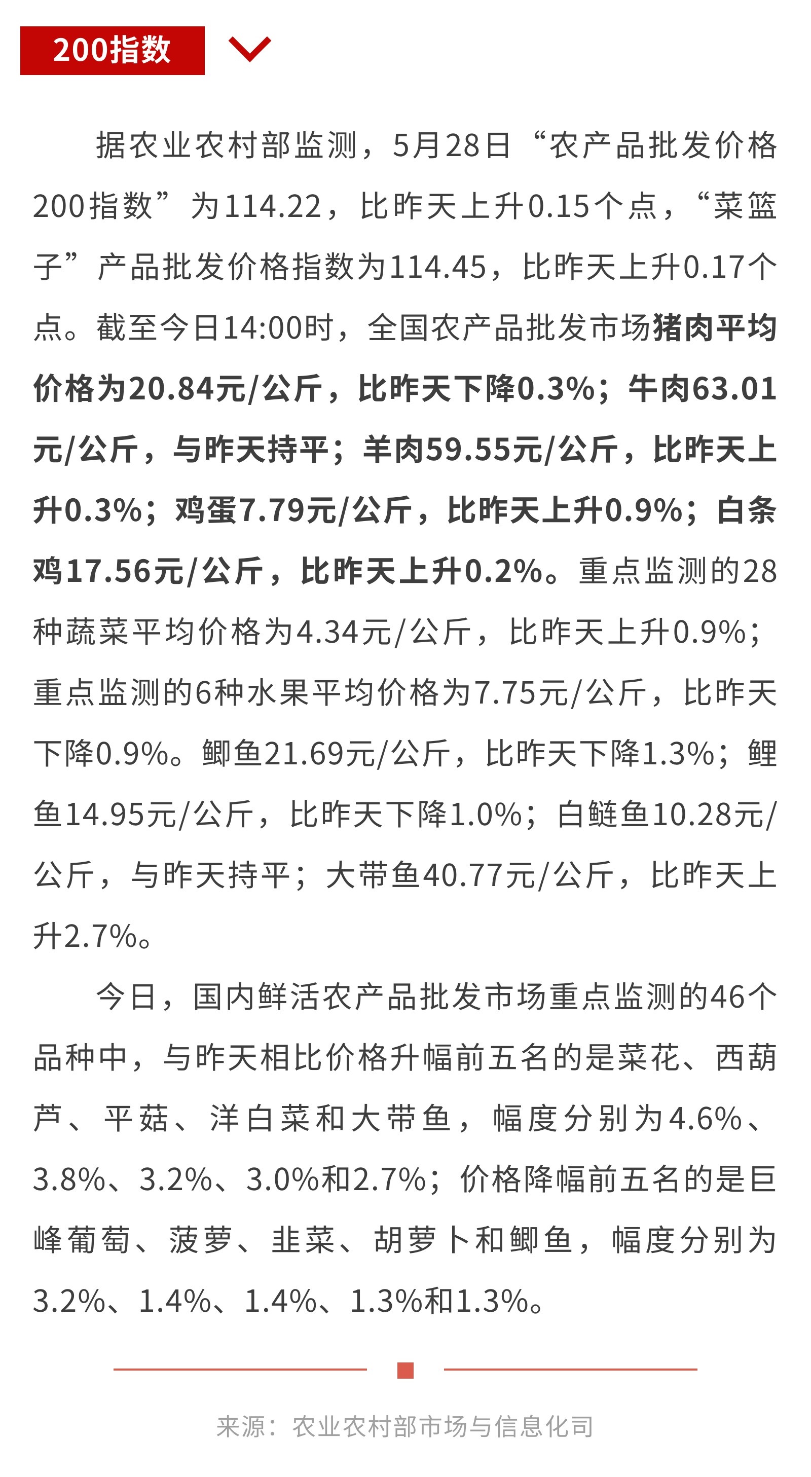 5月29日“农产品批发价格200指数”比昨天下降0.08个点