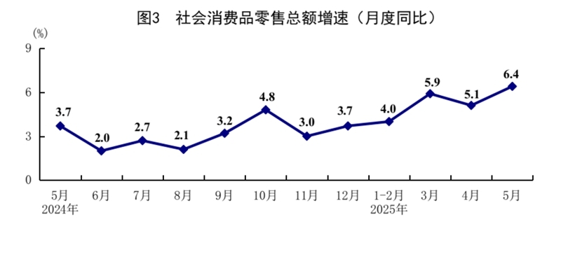 5月份,社会消费品零售总额41326亿元,同比增长6.4%,比上月加快1.3个百分点;环比增长0.93%。按经营单位所在地分,城镇消费品零售额36057亿元,同比增长6.5%;乡村消费品零售额5269亿元,增长5.4%。按消费类型分,商品零售额36748亿元,增长6.5%;餐饮收入4578亿元,增长5.9%。基本生活类和部分升级类商品销售增势较好,限额以上单位粮油食品类、金银珠宝类、体育娱乐用品类商品零售额分别增长14.6%、21.8%、28.3%。消费品以旧换新政策持续显效,限额以上单位家用电器和音像器材类、通讯器材类、文化办公用品类、家具类商品零售额分别增长53.0%、33.0%、30.5%、25.6%。1—5月份,社会消费品零售总额203171亿元,同比增长5.0%。全国网上零售额60402亿元,同比增长8.5%。其中,实物商品网上零售额49878亿元,增长6.3%,占社会消费品零售总额的比重为24.5%。1—5月份,服务零售额同比增长5.2%。