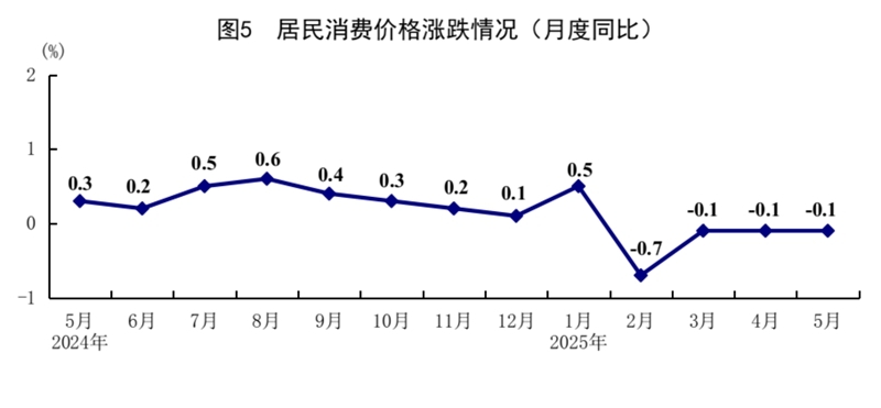 5月份,全国居民消费价格(CPI)同比下降0.1%,环比下降0.2%。分类别看,食品烟酒价格同比上涨0.1%,衣着价格上涨1.5%,居住价格上涨0.1%,生活用品及服务价格上涨0.1%,交通通信价格下降4.3%,教育文化娱乐价格上涨0.9%,医疗保健价格上涨0.3%,其他用品及服务价格上涨7.3%。在食品烟酒价格中,鲜菜价格下降8.3%,粮食价格下降1.4%,猪肉价格上涨3.1%,鲜果价格上涨5.5%。扣除食品和能源价格后的核心CPI同比上涨0.6%,涨幅比上月扩大0.1个百分点。1—5月份,全国居民消费价格同比下降0.1%。