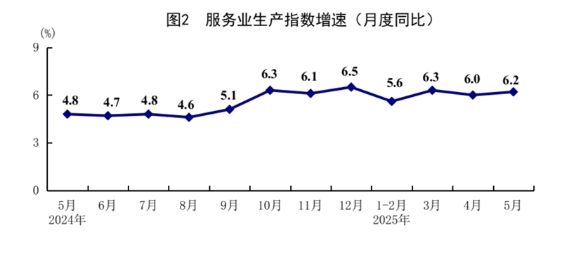 5月份,全国服务业生产指数同比增长6.2%,比上月加快0.2个百分点。分行业看,信息传输、软件和信息技术服务业,租赁和商务服务业,批发和零售业生产指数同比分别增长11.2%、8.9%、8.4%,分别快于服务业生产指数5.0、2.7、2.2个百分点。1—5月份,全国服务业生产指数同比增长5.9%。1—4月份,规模以上服务业企业营业收入同比增长7.2%。5月份,服务业商务活动指数为50.2%,比上月上升0.1个百分点;服务业业务活动预期指数为56.5%,上升0.1个百分点。其中,铁路运输、航空运输、邮政、电信广播电视及卫星传输服务、互联网软件及信息技术服务等行业商务活动指数位于55.0%以上较高景气区间。