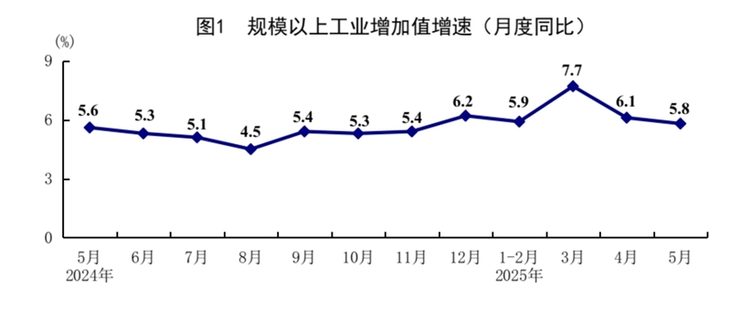 5月份,全国规模以上工业增加值同比增长5.8%,环比增长0.61%。分三大门类看,采矿业增加值同比增长5.7%,制造业增长6.2%,电力、热力、燃气及水生产和供应业增长2.2%。装备制造业增加值同比增长9.0%,高技术制造业增加值增长8.6%,分别快于全部规模以上工业增加值3.2和2.8个百分点。分经济类型看,国有控股企业增加值同比增长3.8%;股份制企业增长6.3%,外商及港澳台投资企业增长3.9%;私营企业增长5.9%。分产品看,3D打印设备、工业机器人、新能源汽车产品产量同比分别增长40.0%、35.5%、31.7%。1—5月份,全国规模以上工业增加值同比增长6.3%。5月份,制造业采购经理指数为49.5%,比上月上升0.5个百分点;企业生产经营活动预期指数为52.5%,上升0.4个百分点。1—4月份,全国规模以上工业企业实现利润总额21170亿元,同比增长1.4%。