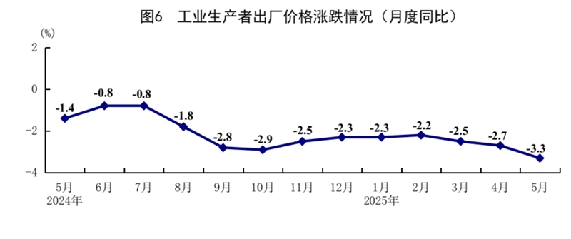 5月份,全国工业生产者出厂价格同比下降3.3%,环比下降0.4%;全国工业生产者购进价格同比下降3.6%,环比下降0.6%。1—5月份,全国工业生产者出厂价格和购进价格均比上年同期下降2.6%。