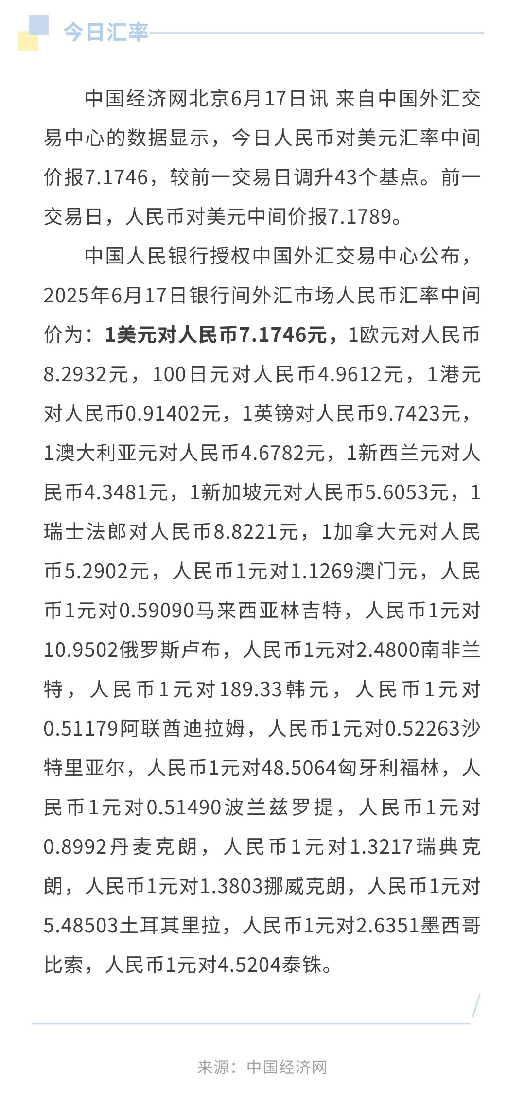6月17日人民币兑美元中间价报7.1746,调升43个基点