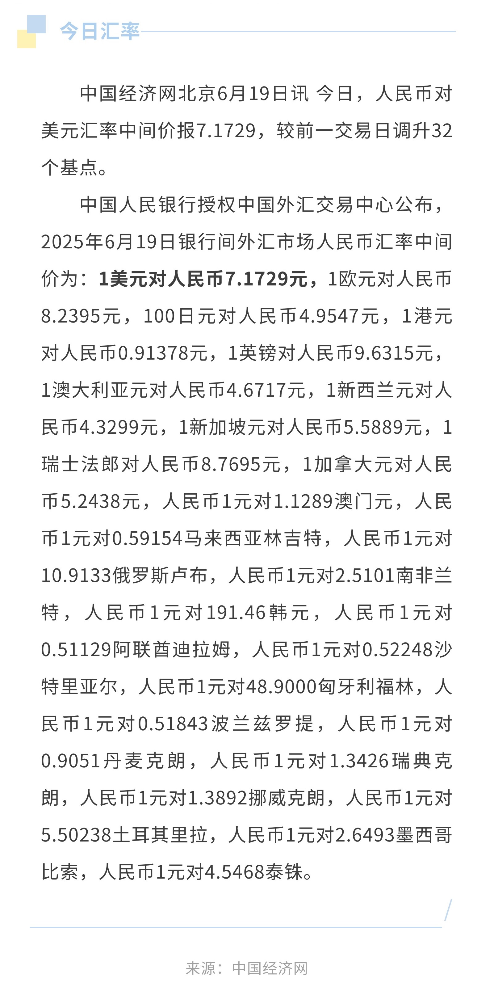 6月19日人民币兑美元中间价报7.1729,调升32个基点