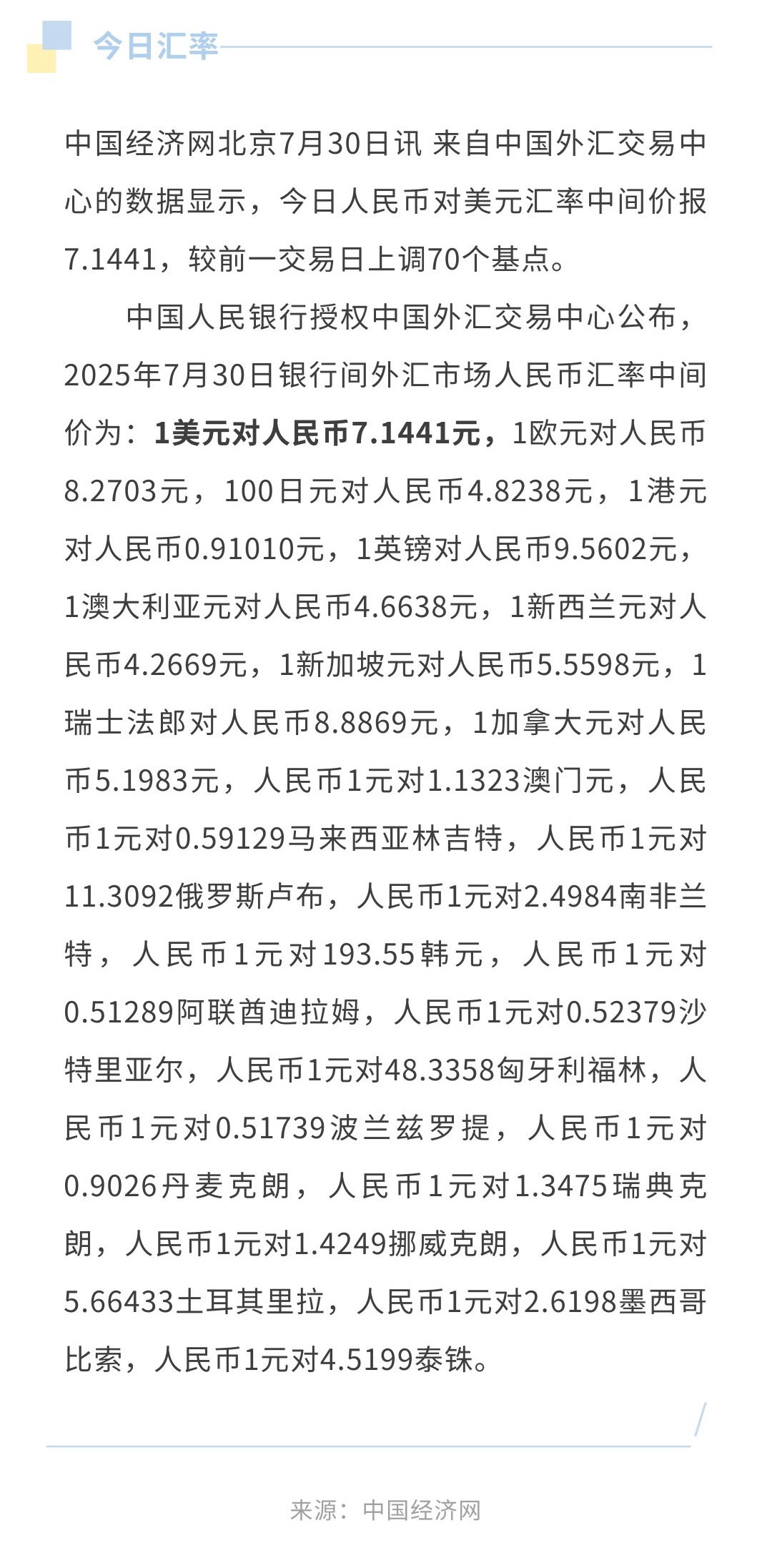 7月30日人民币兑美元中间价报7.1441,上调70个基点