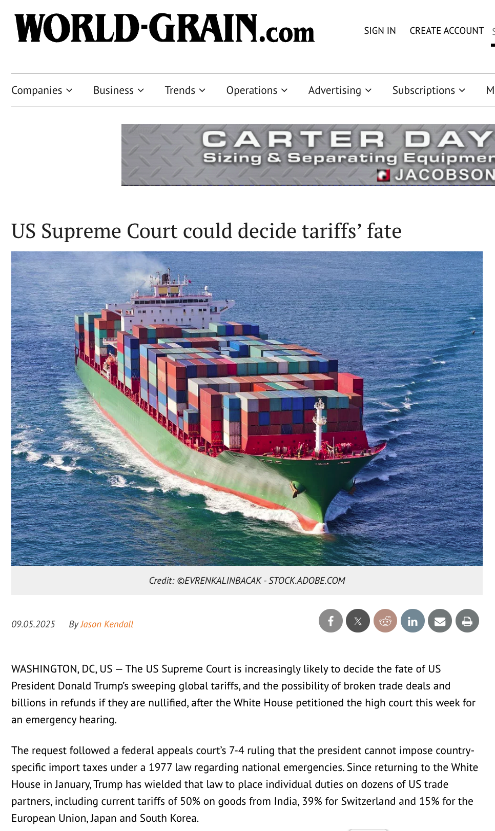 本案源于联邦上诉法院7比4的裁决,该判决认定总统无权依据1977年《国家紧急状态法》对特定国家单方面征收进口税。自今年初重返白宫以来,特朗普总统凭借该法律对印度(50%)、瑞士(39%)、欧盟、日本和韩国(各15%)等多个贸易伙伴实施了差别关税。此外,加拿大和墨西哥也分别被征收35%和25%的关税,但根据《美墨加协定》,大部分农产品贸易仍享受免税待遇。