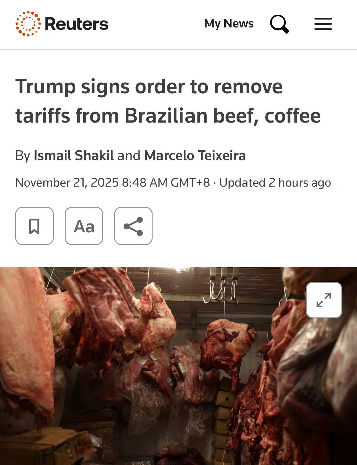 华盛顿消息:11月20日,美国总统特朗普签署行政令,撤销自7月起对巴西牛肉、咖啡、可可、水果等农产品加征的40%附加关税,并规定11月13日及以后到港的巴西相关产品可获豁免,此前已缴税款或可申请退回。