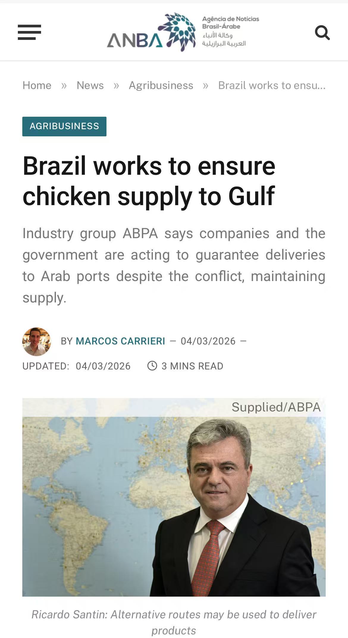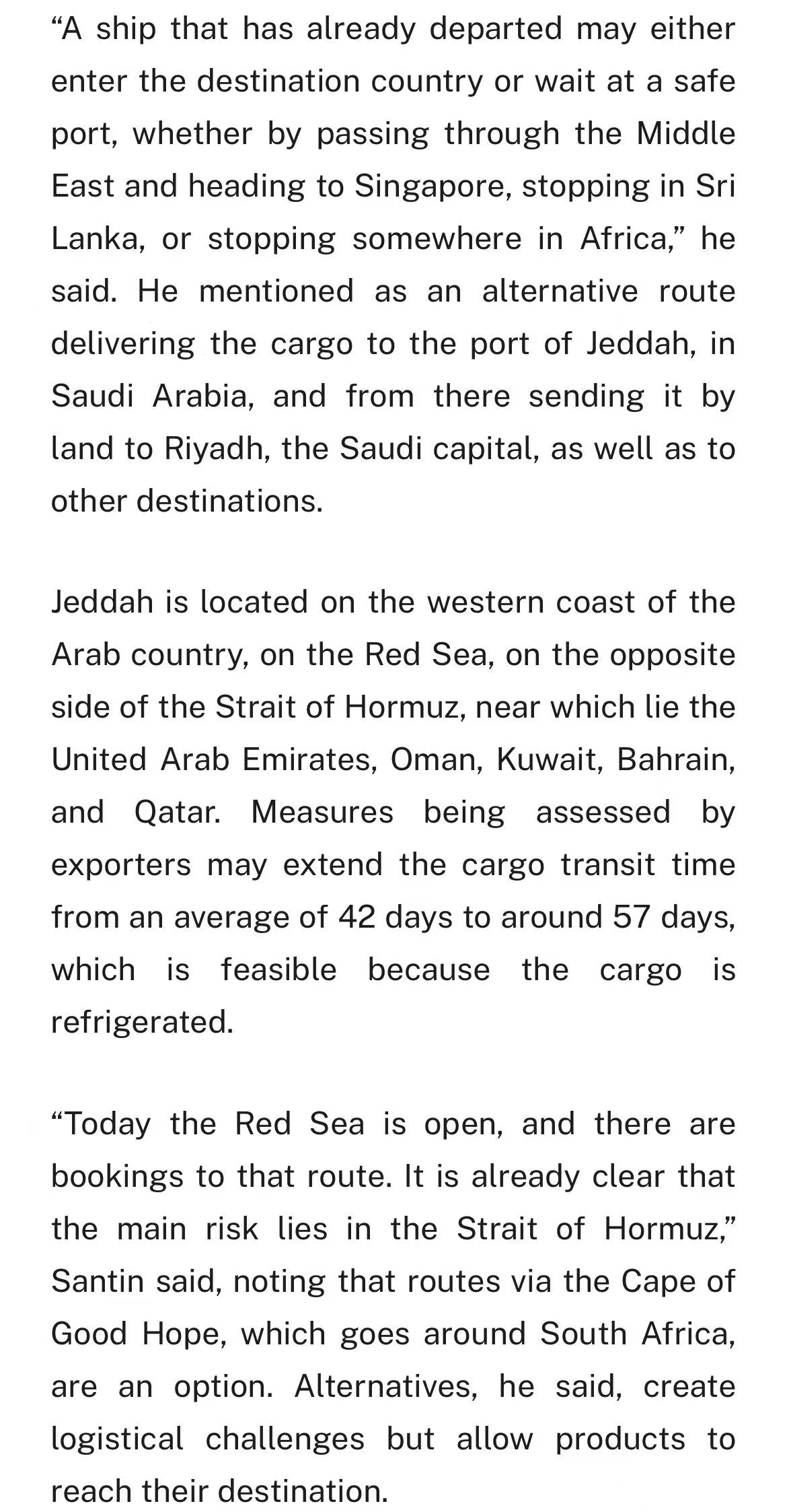 巴西动物蛋白协会(ABPA)主席桑廷最新表态:虽然霍尔木兹海峡局势紧张,但已预订的舱位继续执行,企业正在找替代路线。目前方案包括绕行曼德海峡、从阿曼萨拉拉港陆运、或在阿联酋东海岸卸货。