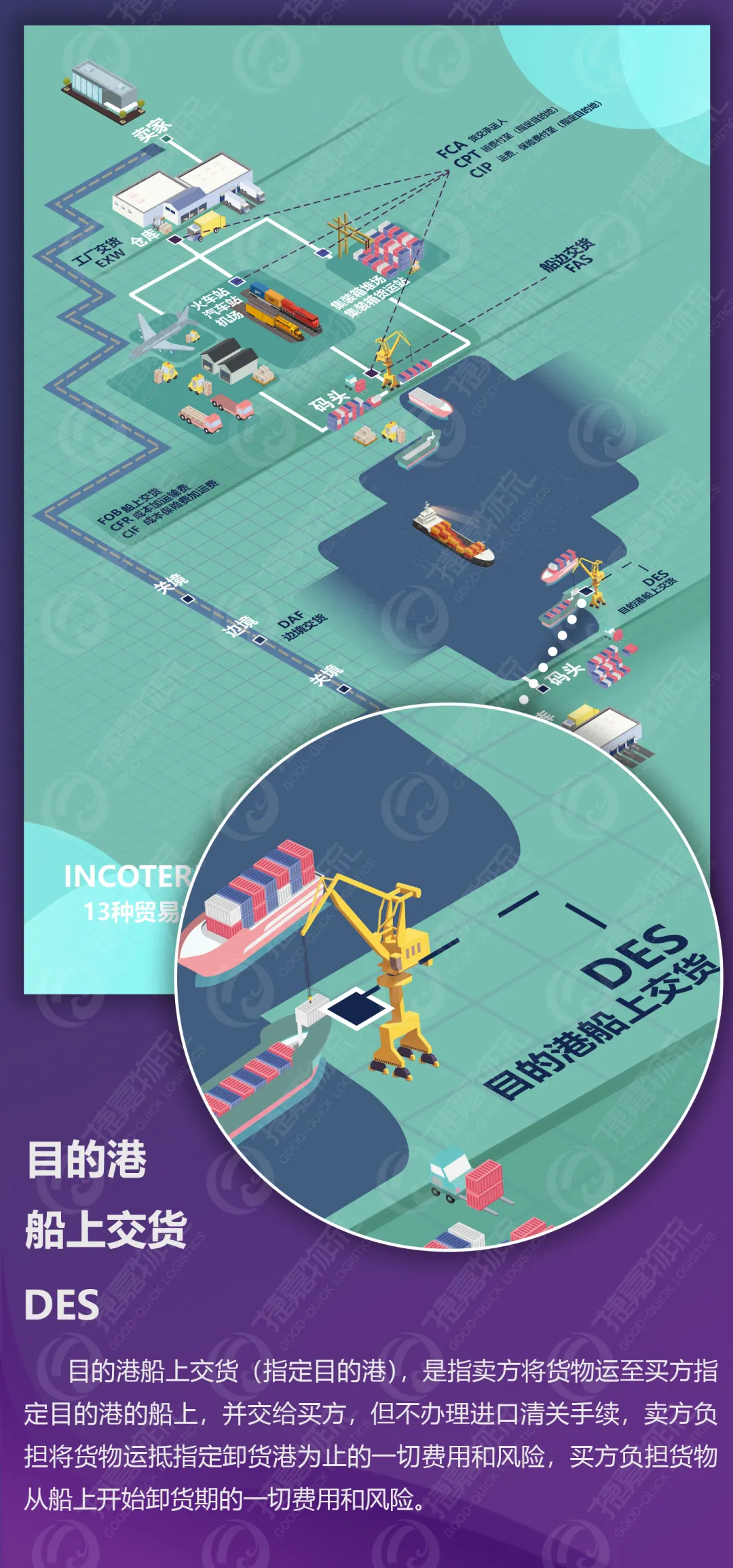 DES交货贸易术语卖方必须承担货物运至指定的目的港卸货前的一切风险和费用。如果当事各方希望卖方负担卸货的风险和费用,则应使用 DEQ 术语。