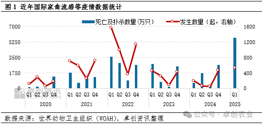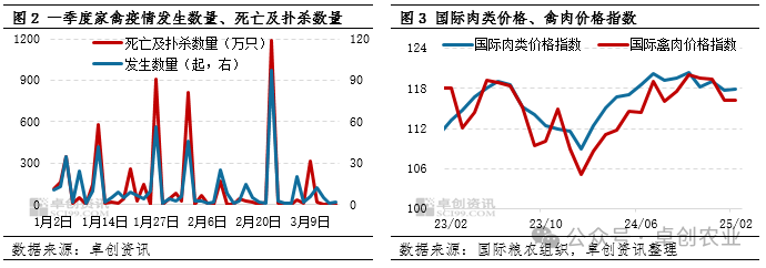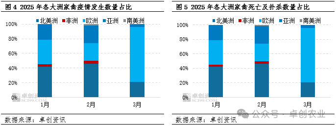 从具体时间来看,今年1-2月份家禽疫情较集中,其中发生数量最高值97起出现在2月24日,家禽死亡及扑杀数量最高达到1187万只。随着气温回升,3月份疫情出现减弱迹象。从出口数据来看,美国1月份鸡肉出口23.2万吨,同比降15.9%,对华出口0.3万吨,同比降23.3%,疫情影响可见一斑;巴西1月份鸡肉出口43.1万吨,同比增9.2%,对华出口4.4万吨,同比增15.4%。从价格来看,今年1-2月国际肉类价格指数、禽肉价格指数较去年12月整体是下行趋势。其中,2月份国际肉类价格指数、禽肉价格指数分别为117.96、116.16,较12月份分别下跌0.91%、2.68%。家禽疫情及北半球进入春节假期导致禽肉进口量减少,也是禽肉价格指数下跌的重要原因。 一季度北美洲家禽流感疫情最为严重 从近年数据来看,亚欧两洲家禽流感较为多发且集中,但今年一季度美洲流感疫情持续加重。从发生数量来看,南北美洲共发生219起,占总量的43%;从家禽死亡及扑杀数量来看,南北美洲总计超过4300万只,占总量的75%。其次是欧洲、亚洲。从具体国家来看,美国、波兰、日本均排在前三位,发生数量占比分别为39.12%、11.83%、6.87%,死亡及扑杀数量占比分别为74.11%、8.67%、6.79%。与此同时,美国哺乳动物(奶牛、家猫)的禽流感仍较为严重。 综上所述,今年一季度国际家禽疫情表现出季度性加重的特点,且集中在1-2月份,3月份有减弱迹象。发生数量处于近年同期较高位,家禽死亡及扑杀数量创历史新高,且新城疫、传喉疫情增加。其中,美国家禽疫情(含哺乳动物)最为严重,发生数量、家禽死亡及扑杀数量均高居首位,导致1月份禽肉出口量明显下降。建议业者持续关注家禽疫情对2-3月国际禽肉出口形势的影响。 来源:卓创农业 发布时间:2025年3月26日 13点36分
