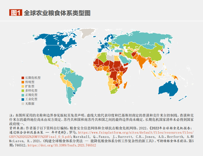 为方便分析,报告将农业粮食体系分为六个类型:长期危机型、传统型、扩张型、多样化型、正规化型、工业化型。这一分类框架便于有针对性地了解每个类型固有的独特挑战和机遇,从而因地制宜制定适当的政策和干预措施。