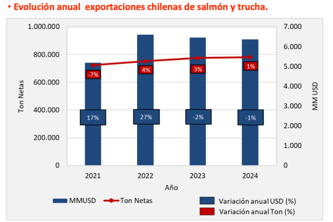 Clement称:“2024年智利全行业停滞不前,产量几乎没有增长,出口额下降,主要市场价格下跌,整体市场陷入低迷。前几年银鲑养殖量上升导致价格暴跌,现在情况有所好转。”