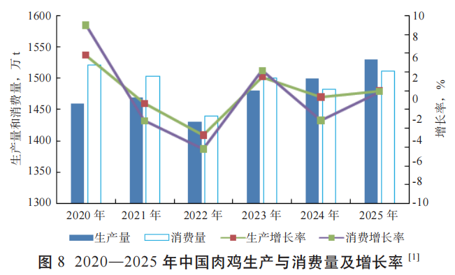 2024年中国肉鸡产量为1 500.00万t,较2023年有小幅度增长,增长率为1.35%。产量上升主要是因为2024年中国有更多祖代鸡可用,国产白羽肉鸡品种在国内市场推广情况良好,与进口品种相比,国产品种的成本较低且生产效率正在提高。在种源供应充裕的有力支撑下,国内白羽肉鸡的出栏量不断攀升。据USDA预测,2025年肉鸡消费量或上升为1 511.50万t,增长率1.92%,在消费增长的拉动下,中国肉鸡产量预计会继续上升至1 530.00万t,增长率2.00%(图8)。
