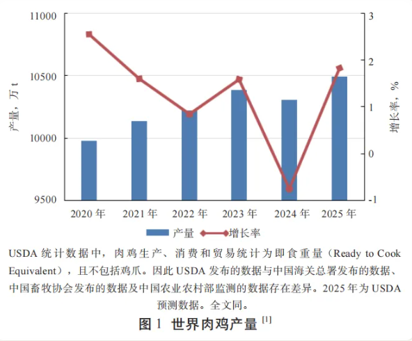 虽然新冠肺炎疫情带来的影响已经逐渐消退,但由于受全球经济持续低迷、中东政局动荡、通胀压力持续居高,以及禽流感频发等影响,全球肉鸡产量下降。根据美国农业部(USDA)数据,2024年全球肉鸡产量为10 304.60万t,较2023年下降78.20万t,降幅0.75%。饲料价格继续相对低位运行和经济增长刺激消费需求增长等为肉鸡生产扩张提供了支持,USDA预测,2025年全球肉鸡产量将会达到10 493.10万t,增长率1.83%(图1)。