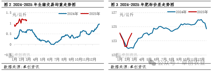 春节前,养殖端出栏大猪节奏快,部分养殖户于春节前将大猪出栏完毕,导致春节后大猪相对稀缺,支撑大猪价格处于高位;同时标猪价格下滑,肥标价差扩大。据卓创资讯监测,春节后肥标价差震荡扩大至中旬,最高为2月13日的1.19元/公斤。肥标价差扩大、标猪价格下滑刺激二次育肥热度提升,同时养殖公司存在压栏行为。卓创资讯监测,春节后样本企业生猪交易均重持续上升,除养殖端按季节性规律主动放缓出栏节奏外,大猪价格高位也是带动养殖端压栏的原因之一。随压栏生猪体重不断增大、大猪存栏增加,肥标价差自2月中旬开始震荡缩小,截至2月26日,卓创资讯监测生猪肥标价差为0.14元/公斤。