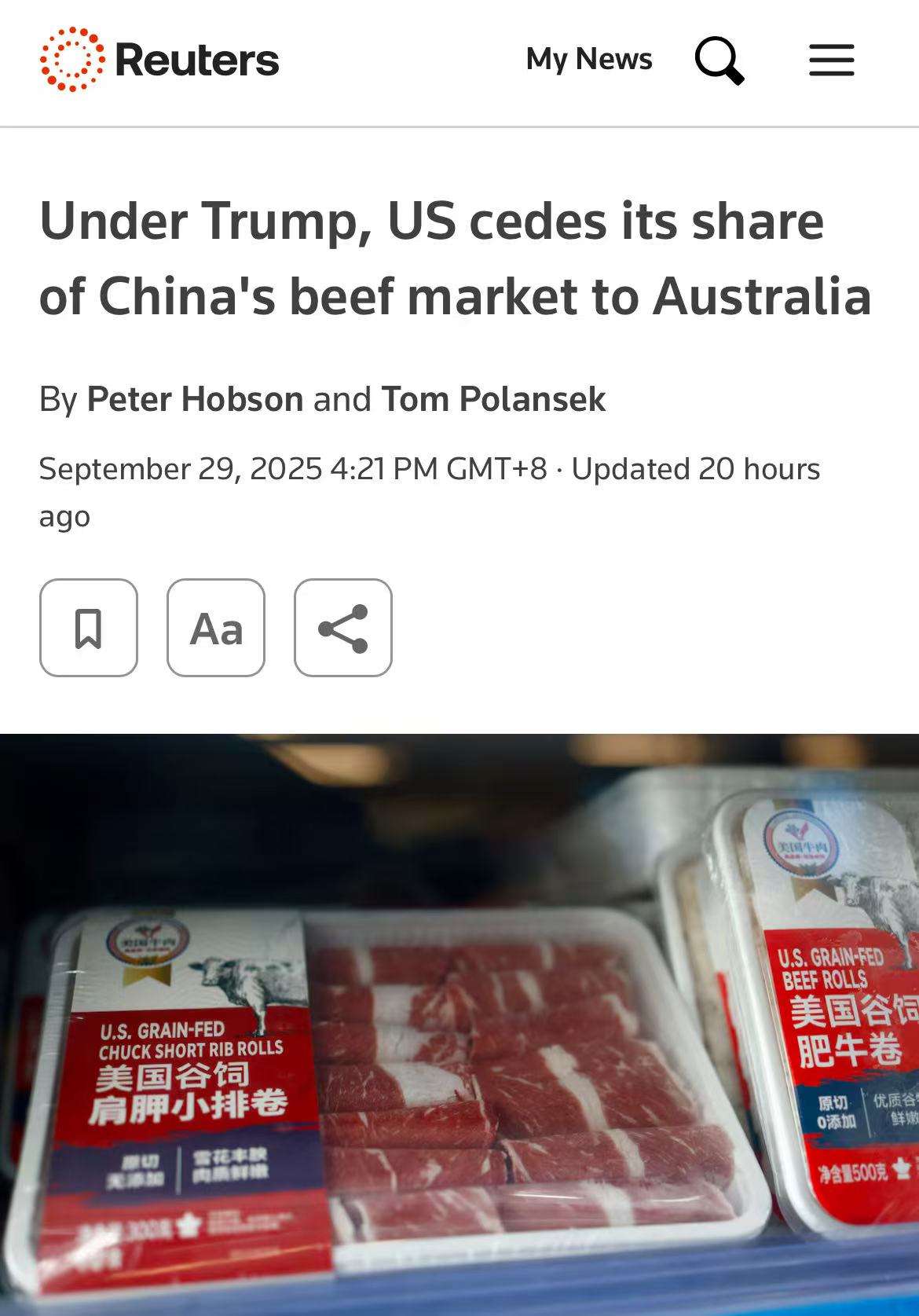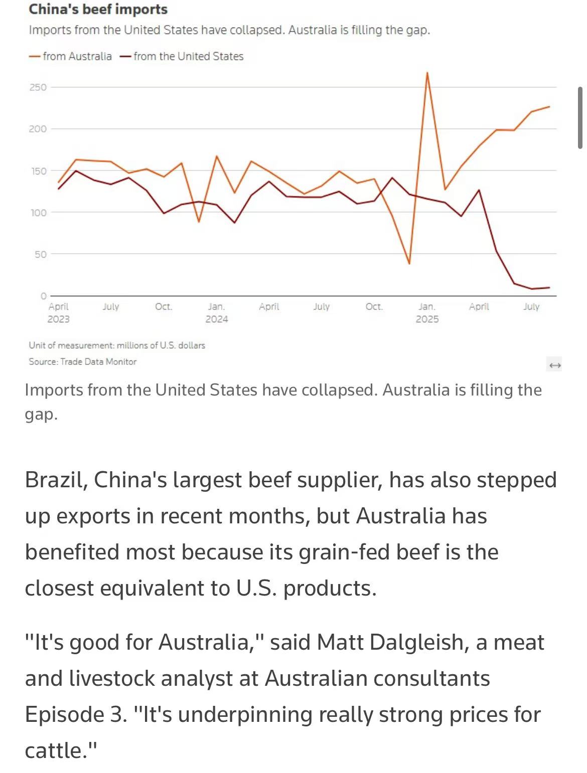 路透社9月29日报道显示,自特朗普重返白宫后,美国牛肉对华出口遭遇断崖式下跌,短短五个月内损失近4亿美元市场份额,而其主要竞争对手澳大利亚则成为最大赢家,对华出口激增。
