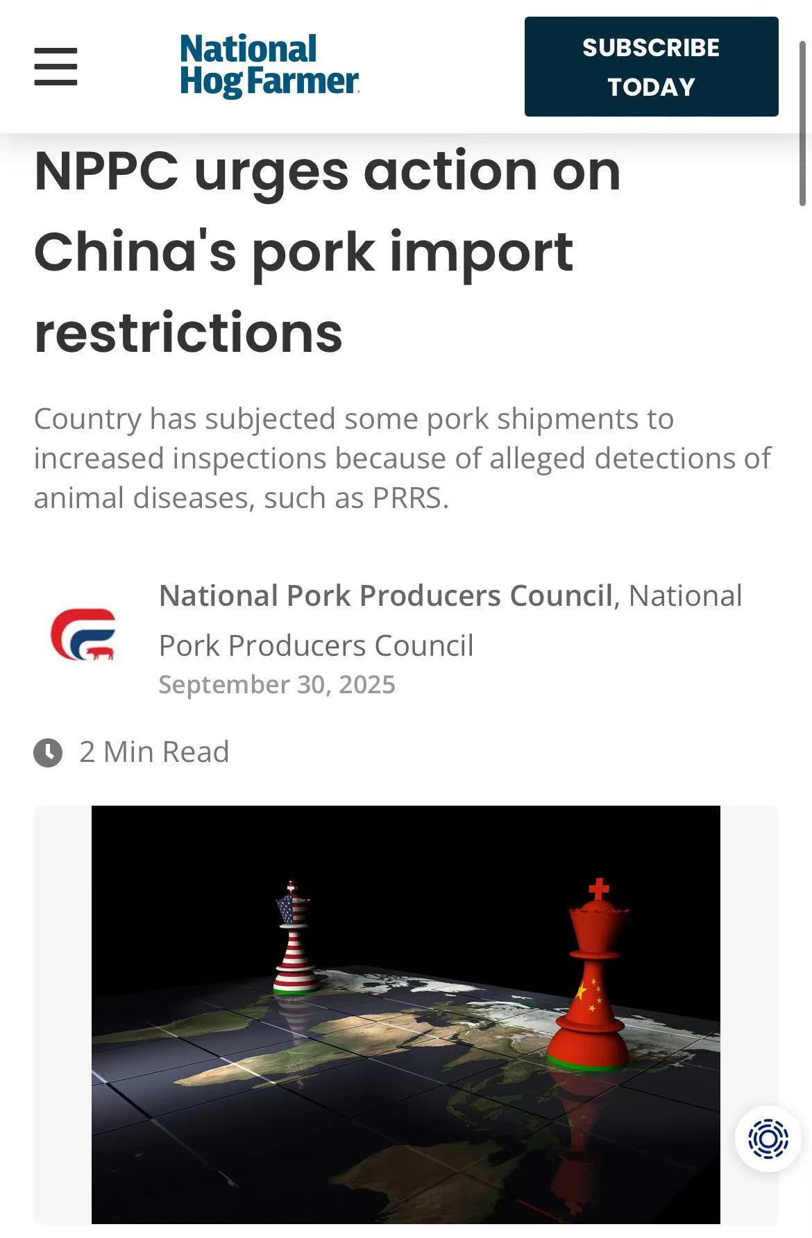 NPPC表示,尽管2020年中美第一阶段经贸协议包含市场准入条款,但中国仍通过高关税、国内补贴及多项不符合世贸规则的动植物检疫措施限制进口。此外,中国近期未更新约400家美国牛肉企业和9家猪肉工厂的出口资质,导致这些企业无法继续对华出口。