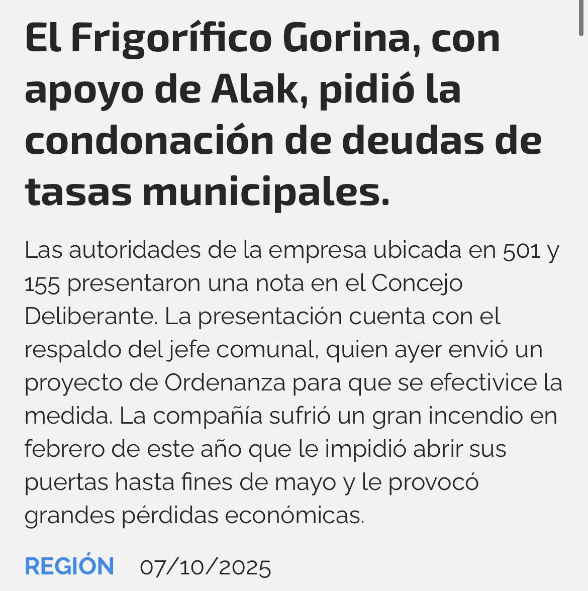 位于拉普拉塔市501街与155街的戈里纳肉类加工厂(又称阿根廷2025厂)近日正式向市审议委员会提交文件,请求豁免其至今所欠的市政税款。该申请已获得市长胡利奥·阿拉克的支持,市长已向市议会提交相关条例草案以推动落实。