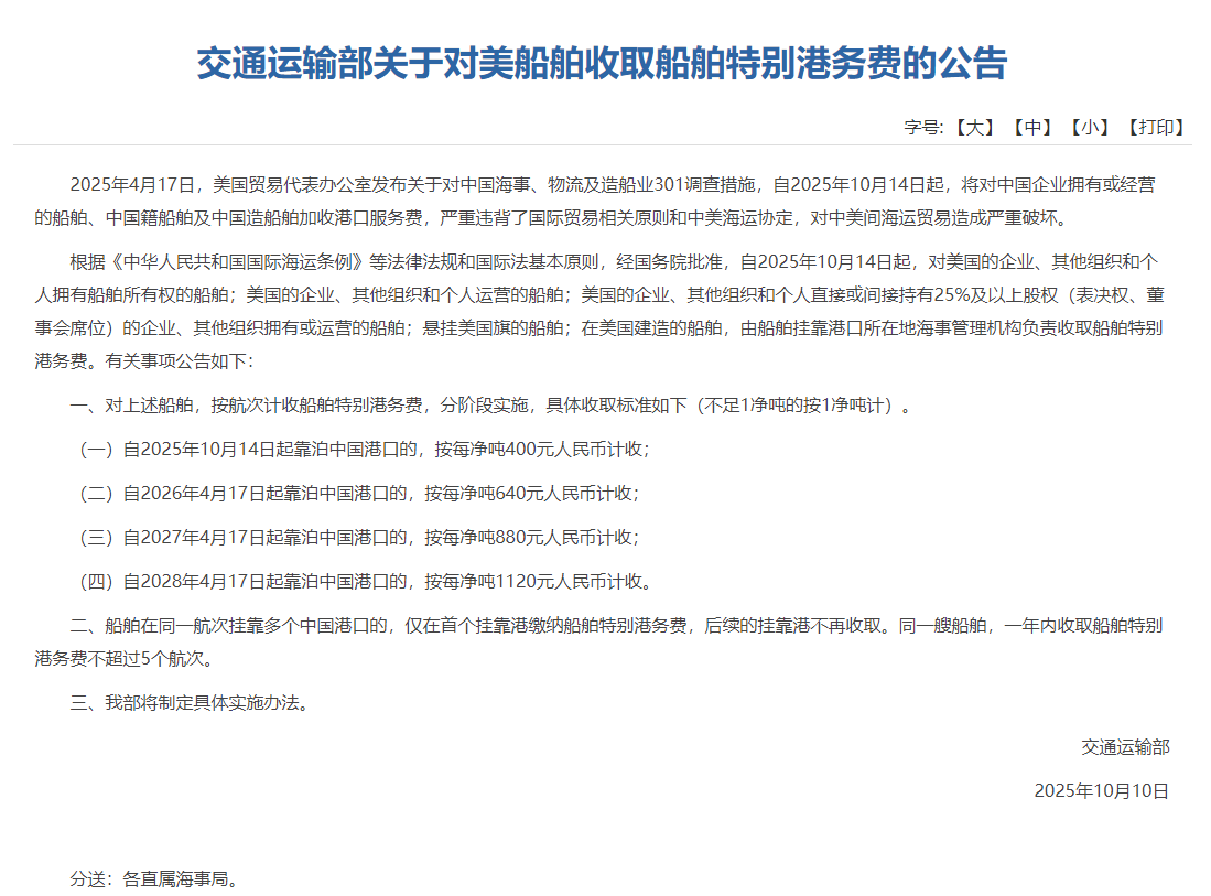 昨日,交通运输部发布了关于对美船舶收取船舶特别港务费的公告,内容宣布:自2025年10月14日起,对美国的企业、其他组织和个人拥有船舶所有权的船舶;美国的企业、其他组织和个人运营的船舶;美国的企业、其他组织和个人直接或间接持有25%及以上股权(表决权、董事会席位)的企业、其他组织拥有或运营的船舶;悬挂美国旗的船舶;在美国建造的船舶,由船舶挂靠港口所在地海事管理机构负责收取船舶特别港务费。