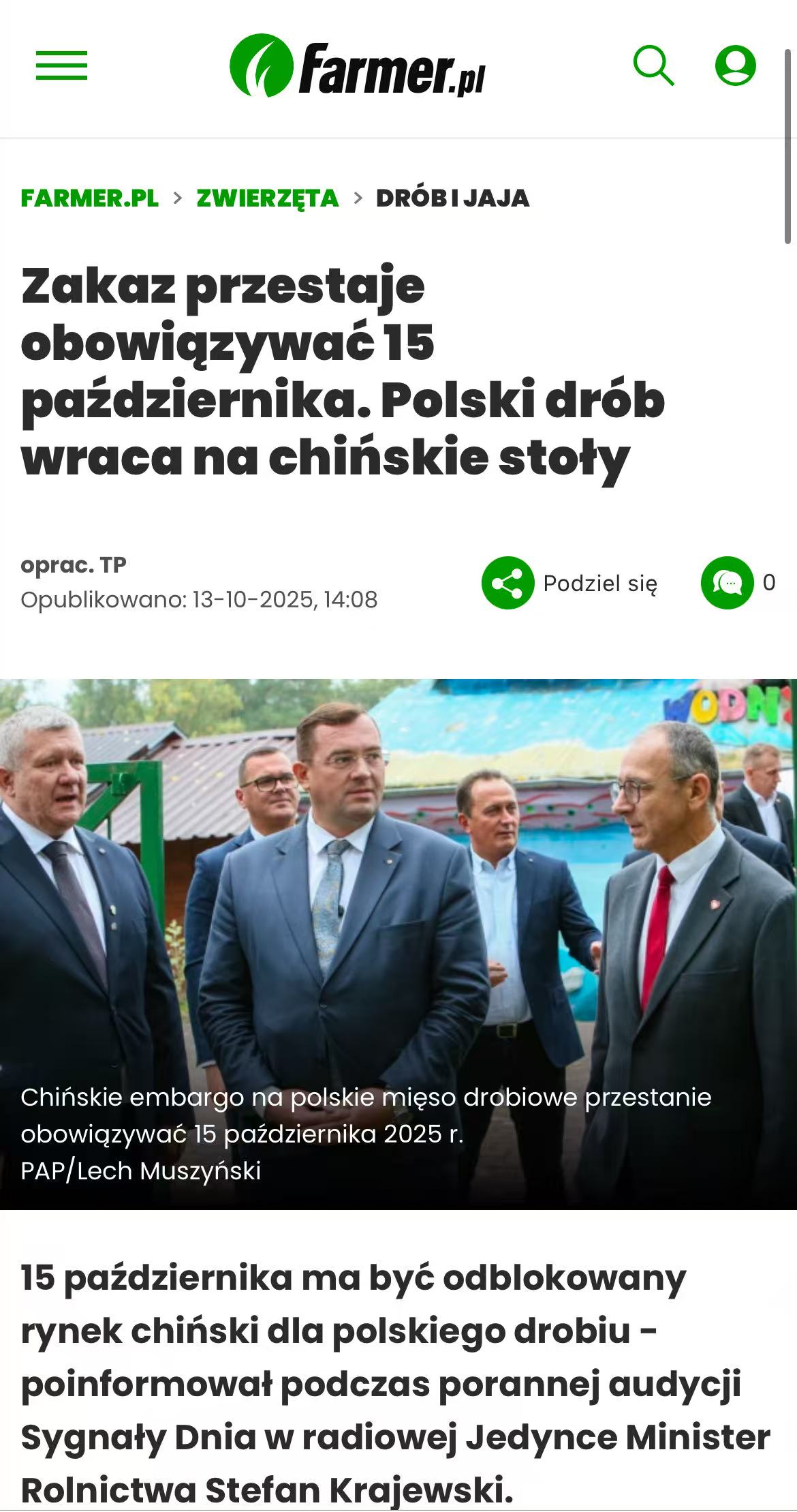根据波兰与中国于今年9月达成的协议,自2024年9月4日起实施的波兰禽肉对华出口禁令将于10月15日正式解除。波兰农业部长斯特凡·克拉耶夫斯基在波兰广播一台的晨间节目中确认了这一消息。