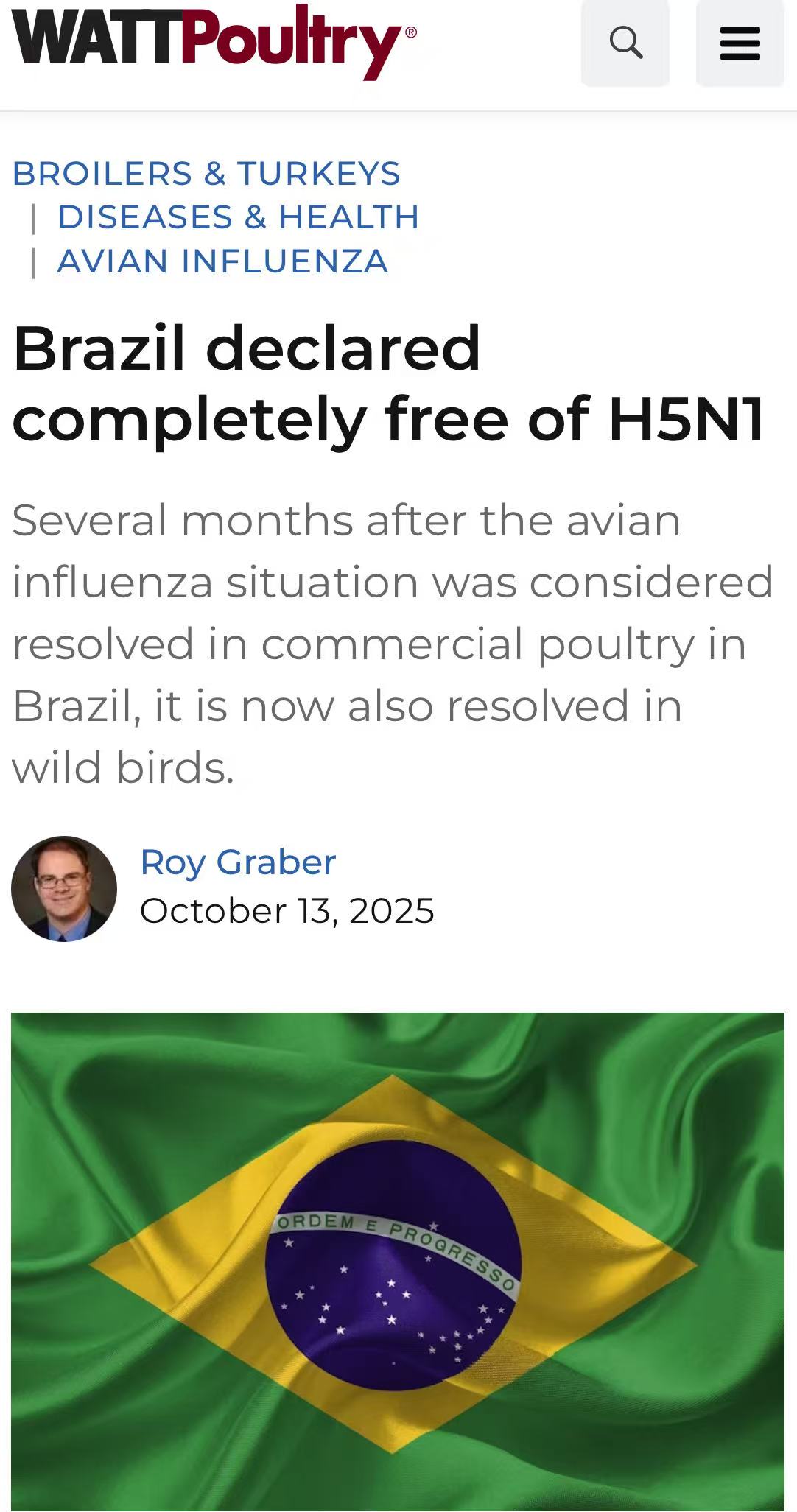 巴西获WOAH认证成为H5N1禽流感无疫国,