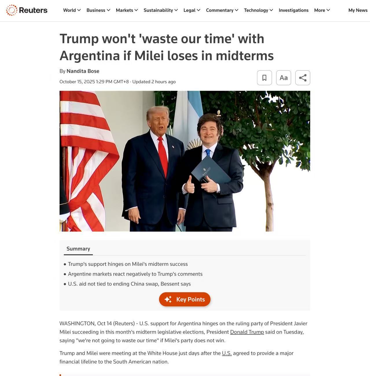 路透社华盛顿10月14日电 美国总统特朗普周二在与阿根廷总统米莱会晤时明确表示,美国对阿支持取决于米莱执政党在本月中期立法选举中的表现。"如果米莱的政党赢不了,我们就不会浪费时间,"特朗普在白宫午餐会上强调,"如果他赢,我们就支持他;如果他输,我们就走人。"