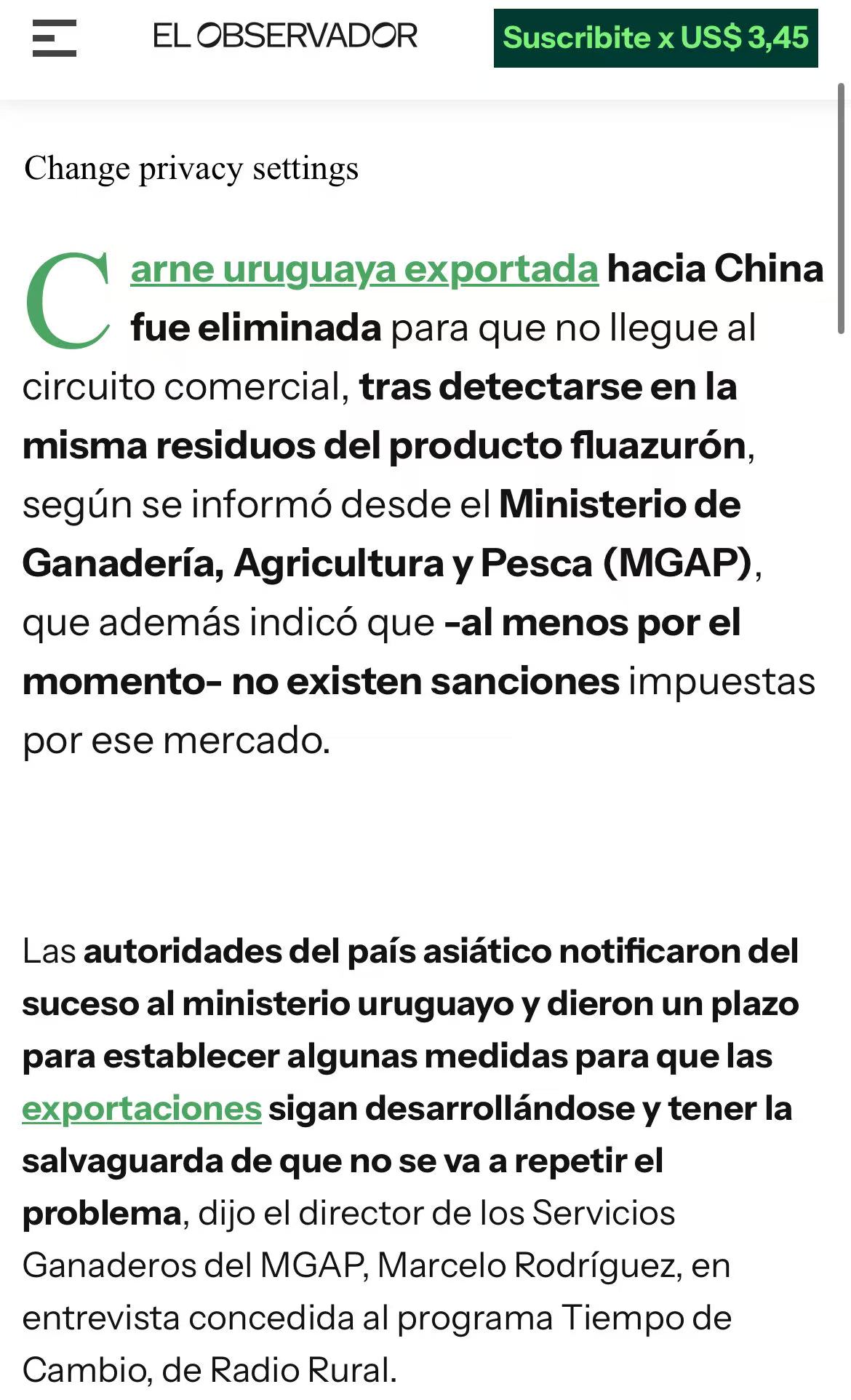 乌拉圭官方表示,该国实施的"国家生物残留监测计划"负责对动物产品进行检测,其中包括对杀蜱剂的监控,并称乌拉圭是区域内进行残留检测频次较高的国家之一。