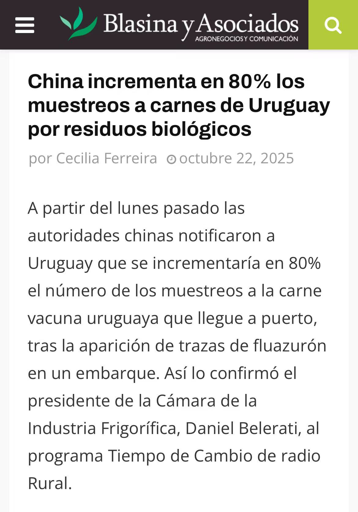 乌拉圭肉类加工商会主席丹尼尔·贝拉蒂在接受采访时证实了这一消息。他解释道,这意味着“假设以前每100个集装箱抽检20个,现在要抽检36个,这在统计上就增加了发现异常的可能性。”