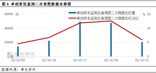 10月中旬猪价降至相对低位后,二次育肥热度提升,随着猪价上涨、二次育肥补栏进度基本完成,热度于10月底开始下降,10月31日卓创资讯监测样本企业周度二次育肥占比为9.45%。据卓创资讯调研,进入11月后,二次育肥热度同样较为平淡,对猪价的支撑力度减弱。