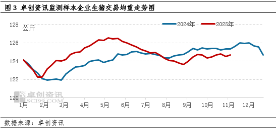 从10月份开始,部分养殖企业看跌后市,已开始冲量动作。从交易均重季节性看,四季度气温较低,生猪生长速度加快,生猪交易均重多上升,卓创资讯监测2021-2024年10月中旬到11月上旬生猪交易均重多呈上升态势,过去五年平均上升1.28公斤。但2025年11月6日生猪交易均重为124.65公斤,交10月中旬基本持平,表明养殖企业有降低体重、加速出栏动作,支撑供应增加,利空生猪价格。