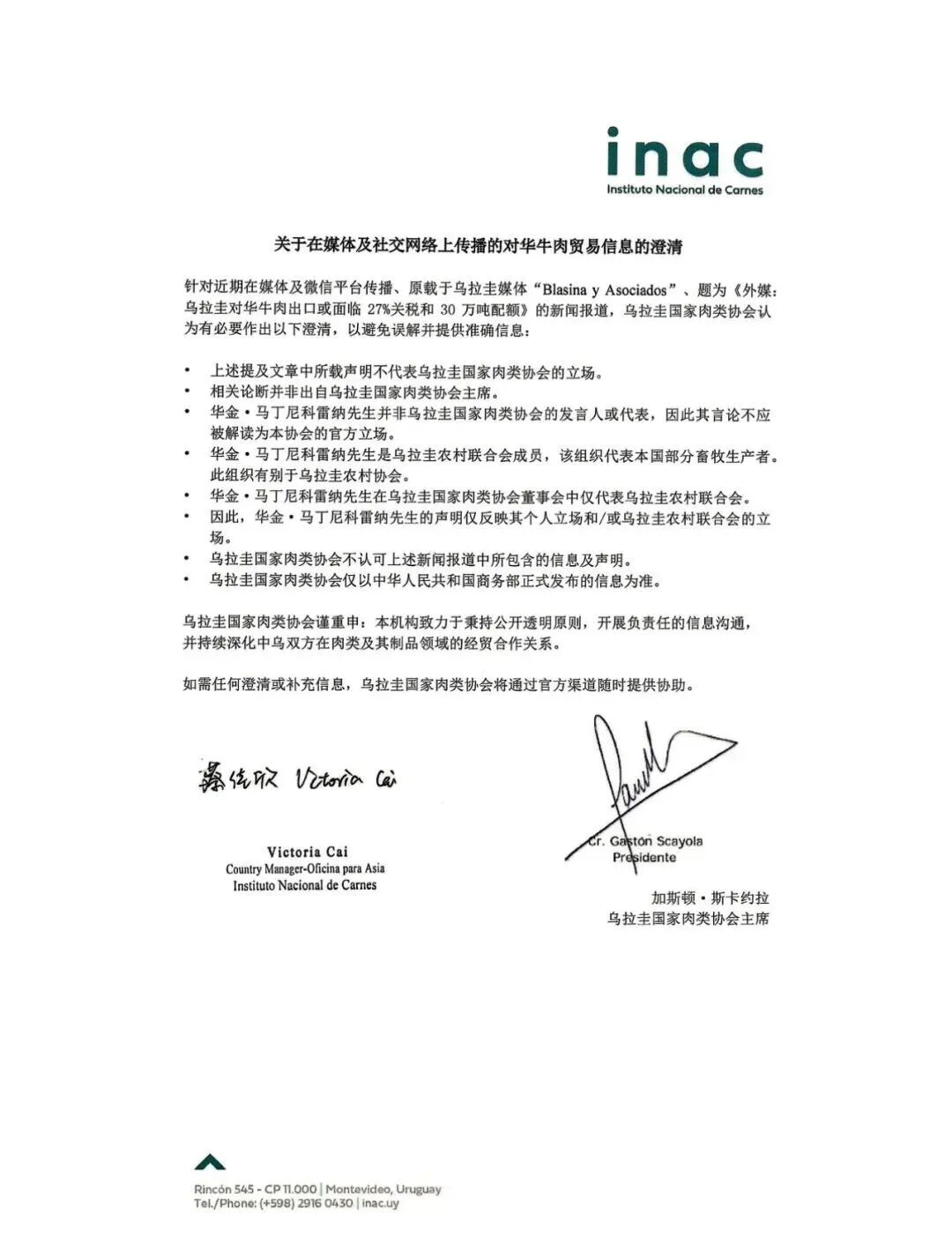 乌拉圭国家肉类协会关于在媒体及社交网络上传播的对华牛肉贸易信息的澄清