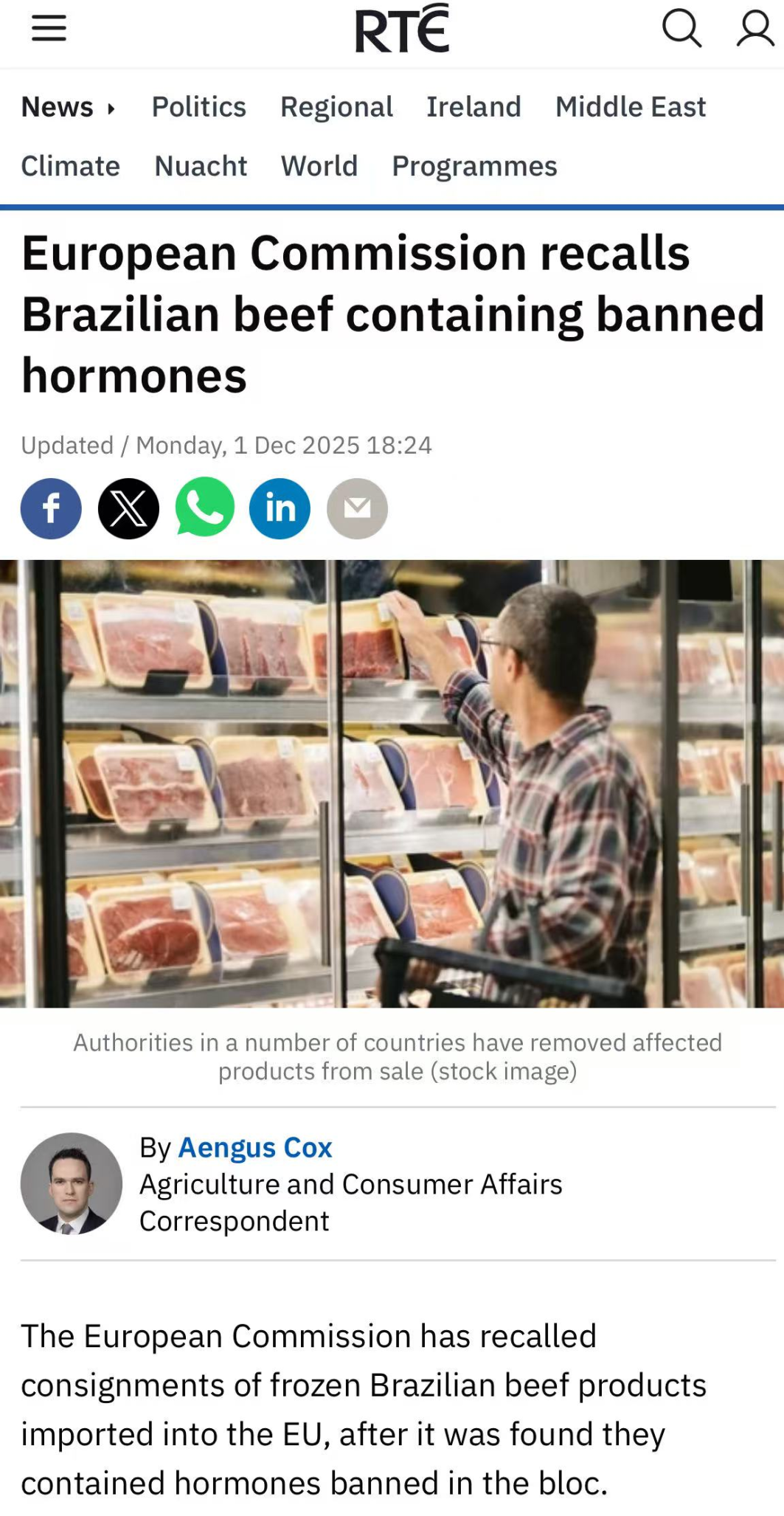 此次事件令巴西肉类监管体系再次受到质疑。爱尔兰农民协会指出,这暴露了巴西在屠宰场监管方面的严重不足,并警示欧盟正在推进的与南方共同市场(南共市)贸易协定可能带来风险——该协议拟以7.5%低关税向欧盟新增99,000吨南美牛肉进口配额,但欧洲农民担心其生产标准无法达到欧盟要求。