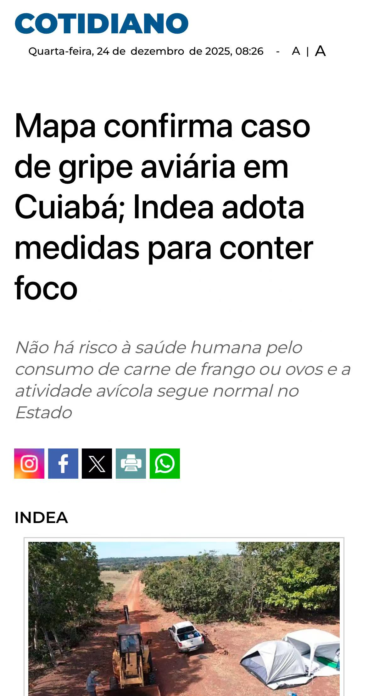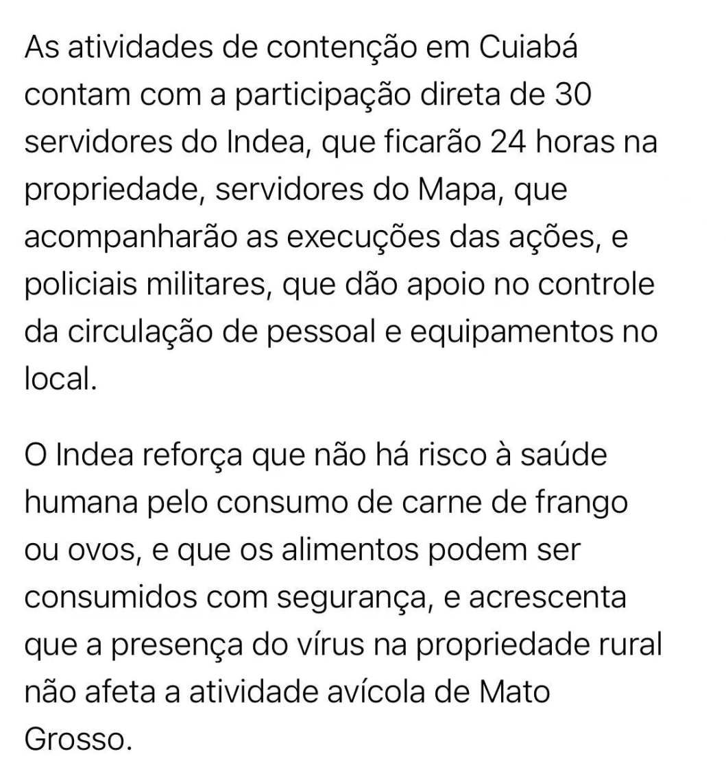 巴西农畜牧业部确认,在马托格罗索州库亚巴市一户散养家禽的农场中检出高致病性禽流感病毒。该结果由权威检测机构——位于坎皮纳斯的联邦农业防御实验室最终确认。