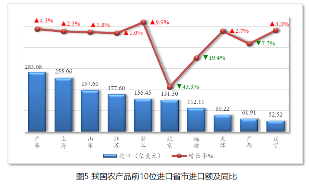 1-11月,国内前十位省市农产品进口额合计1,528.8亿美元,比上年同期下降6.6%,占全国农产品进口总额80.9%。广东、上海、山东仍是前三大主力进口省市,同比均保持小幅增长。浙江同比增长9.9%,在前十位省市中继续保持增速领先;辽宁、天津、江苏分别小幅增长3.3%、2.7%和1%。而北京和福建进口额同比分别下降43.3%和19.4%,广西同比下降7.7%。
