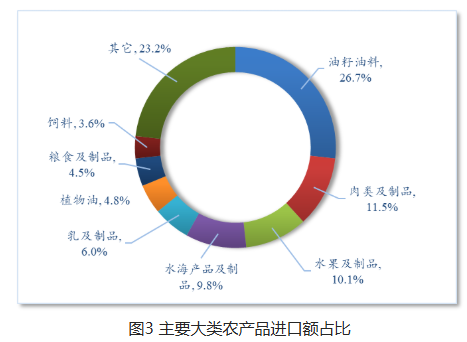 今年前11个月,部分传统大宗农产品进口有所收缩,其中油籽油料作为第一大农产品进口品类,进口额占比达26.7%,但同比下降8.4%;粮食及制品占比4.5%,同比大幅下降46.1%;饲料占比3.6%,同比亦下降7.3%。而与此同时,肉类及制品、水果及制品、水海产品及制品、乳及制品、植物油等大类农产品进口均实现同比增长,特别是水海产品、乳制品和植物油进口增幅均超过10%。