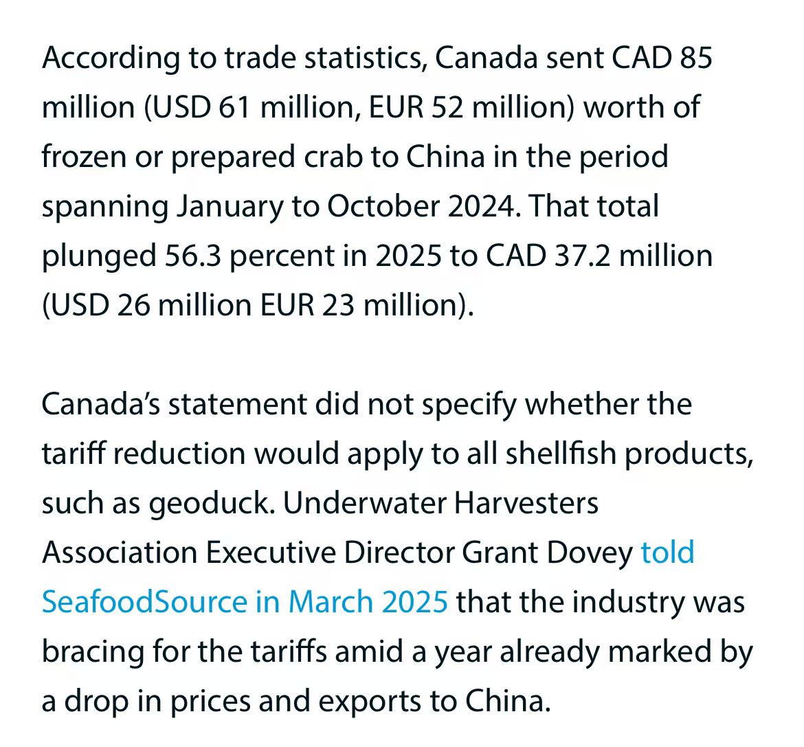 若消息落地,加拿大龙虾出口有望快速回血。2025年1—10月,加拿大对华鲜活龙虾出口额同比跌35%至2.72亿加元,局部码头价一度跌破成本线。关税消息传出后,新斯科舍省Fundy湾现货价已反弹至每磅12.5加元。
