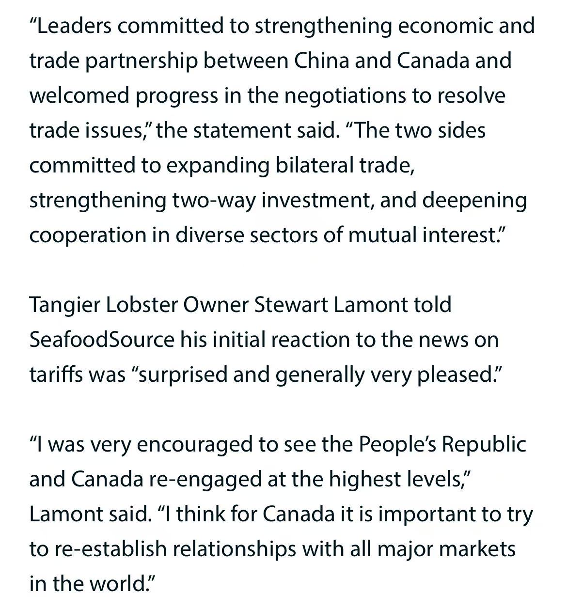 目前消息源自加方与外媒,中国财政部、海关总署尚未公告,最终清单与执行时间仍待确认。若双方按此推进,加拿大渔业或率先受益,中国消费者也有望重新获得价格优势明显的深海龙虾、雪蟹等选择。我们继续关注官方文件与终端价格走势,期待贸易共识转化为实际市场利好。