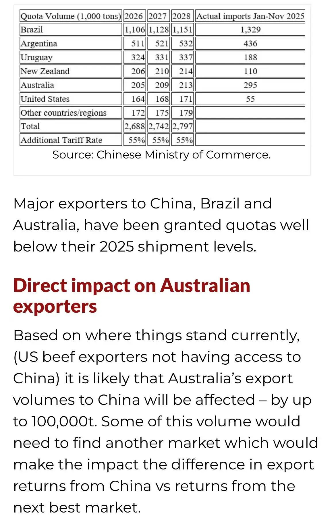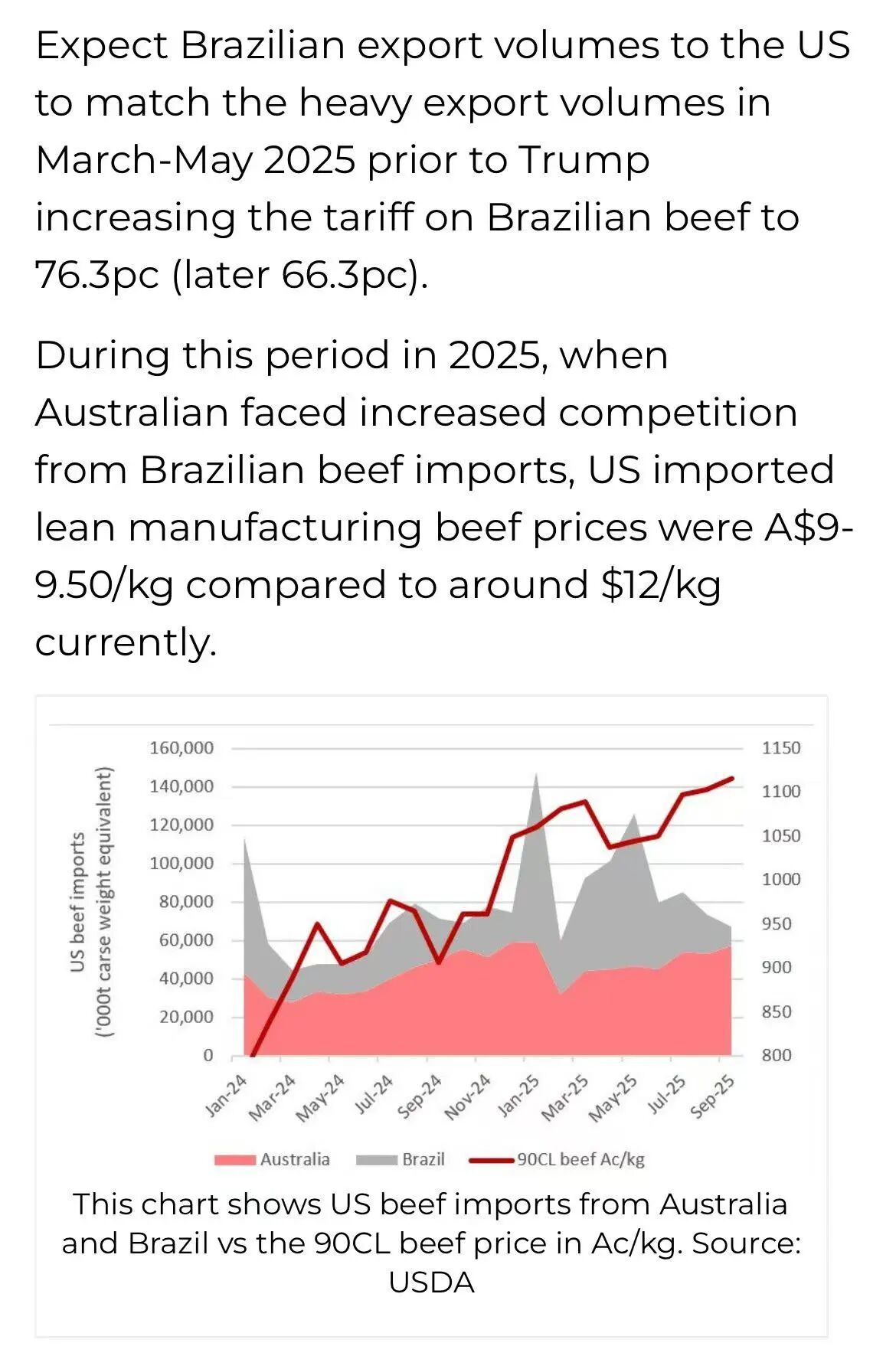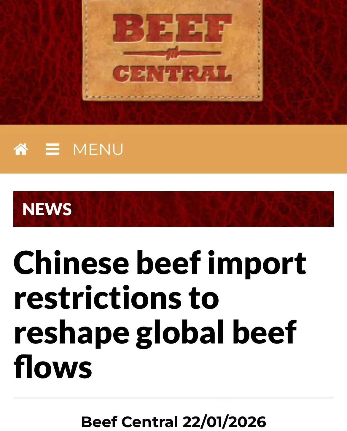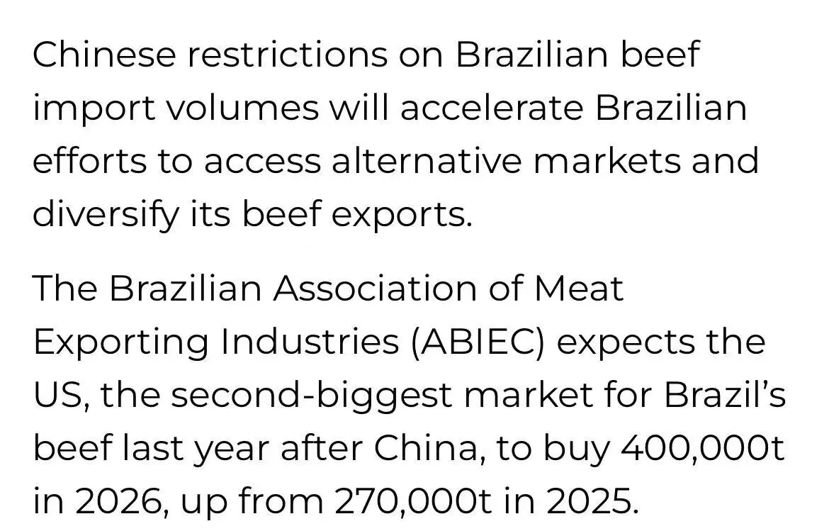 为稳定国内产业,中国将于2026年对牛肉进口实施配额管理,总量限制在约270万吨。此举将直接冲击两大主要供应国:根据市场分析,届时预计将有高达60万吨巴西牛肉和10万吨澳大利亚牛肉无法按原有规模进入中国市场,急需寻找替代买家。