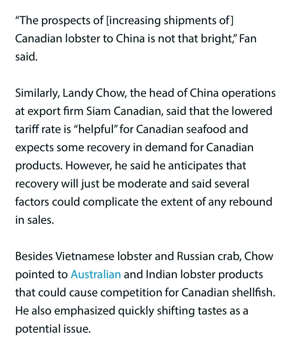 加拿大龙虾在华面临越南、俄罗斯激烈竞争