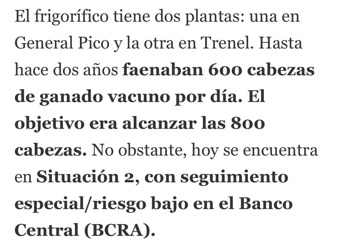 该企业在拉潘帕省拥有 General Pico(2531 厂)和 Trenel(2792 厂) 两家工厂,此前日屠宰量可达 600 头。财务报告显示,其银行债务达 227.7 亿比索,主要债权方包括拉潘帕银行、科尔多瓦银行及阿根廷国家银行。此外,企业在过去半年内有 1012 张支票因资金不足遭退票,金额约 115.9 亿比索,同时还有 ANSES 社保欠款及对养殖商的未结货款。