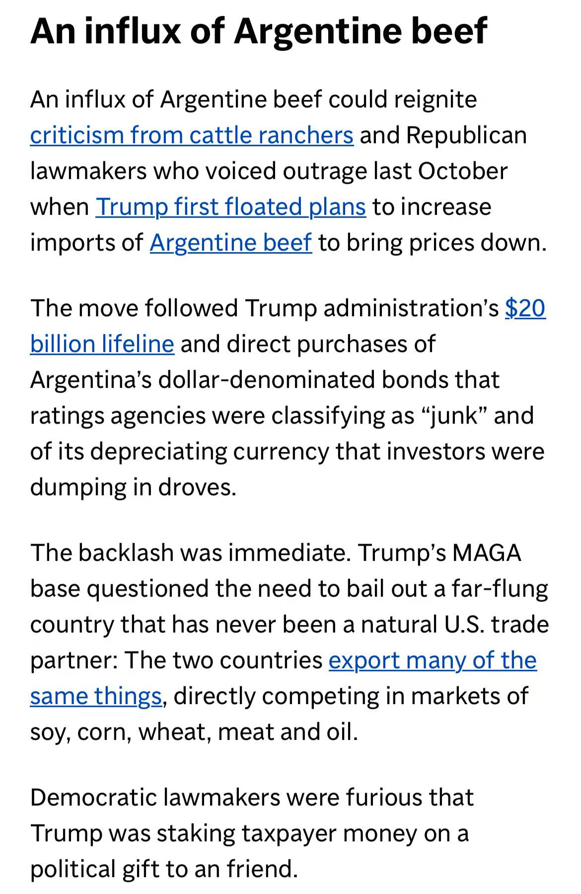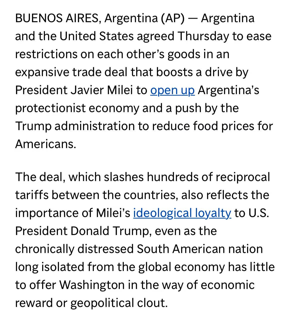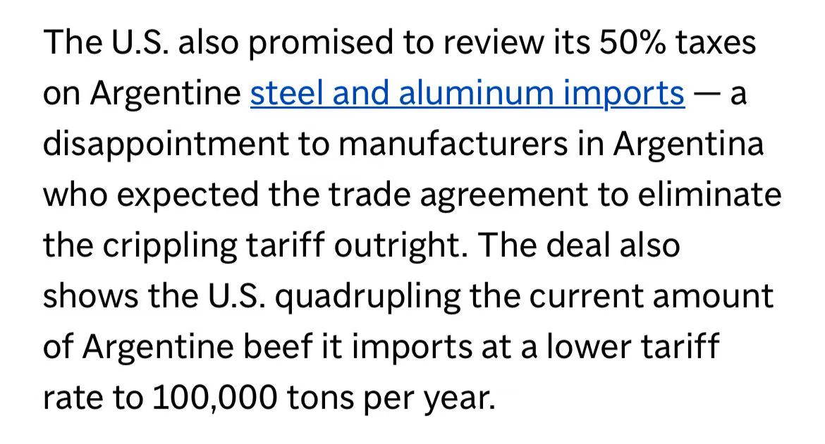 协议同时反映出双方在政治与战略层面的靠拢。米莱上任后多次访美,两国在多项政策上协调一致。尽管协议细节与实施时间表尚未完全公布,但对阿根廷畜牧业与整体经济而言,这项贸易突破无疑是一次历史性机遇。
