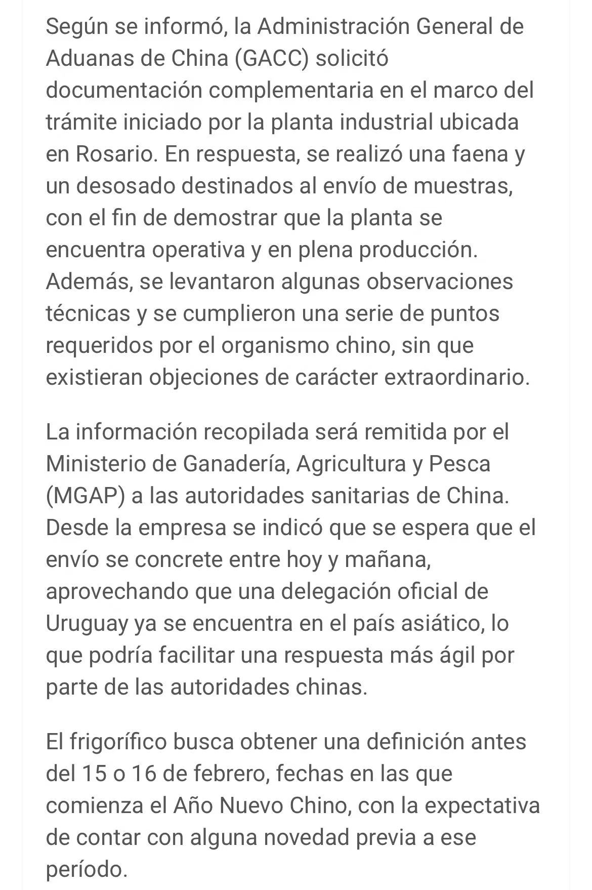 此次审批进程得益于乌拉圭官方代表团近期访华的推动,有望加快中方审核速度。该工厂希望于2月15日或16日前获得最终许可,从而实现节前向中国发运牛肉。此次准入申请也被视为乌拉圭总统访华的合作成果之一,工厂首批产品已启动发往中国的流程。