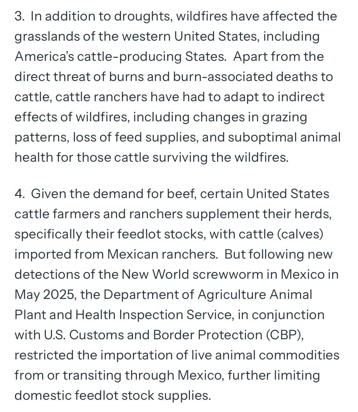 该决定基于美国当前畜牧业的现实困境。近年来持续干旱、野火等自然灾害导致多州牧场受损,牛群存栏量降至历史低位。同时,国内碎牛肉价格已攀升至数十年来的高点。为保障市场供应、稳定肉类价格,美国政府决定临时增加进口配额。
