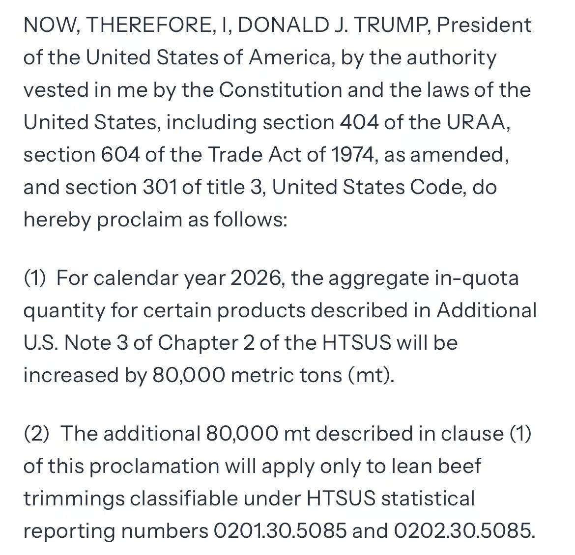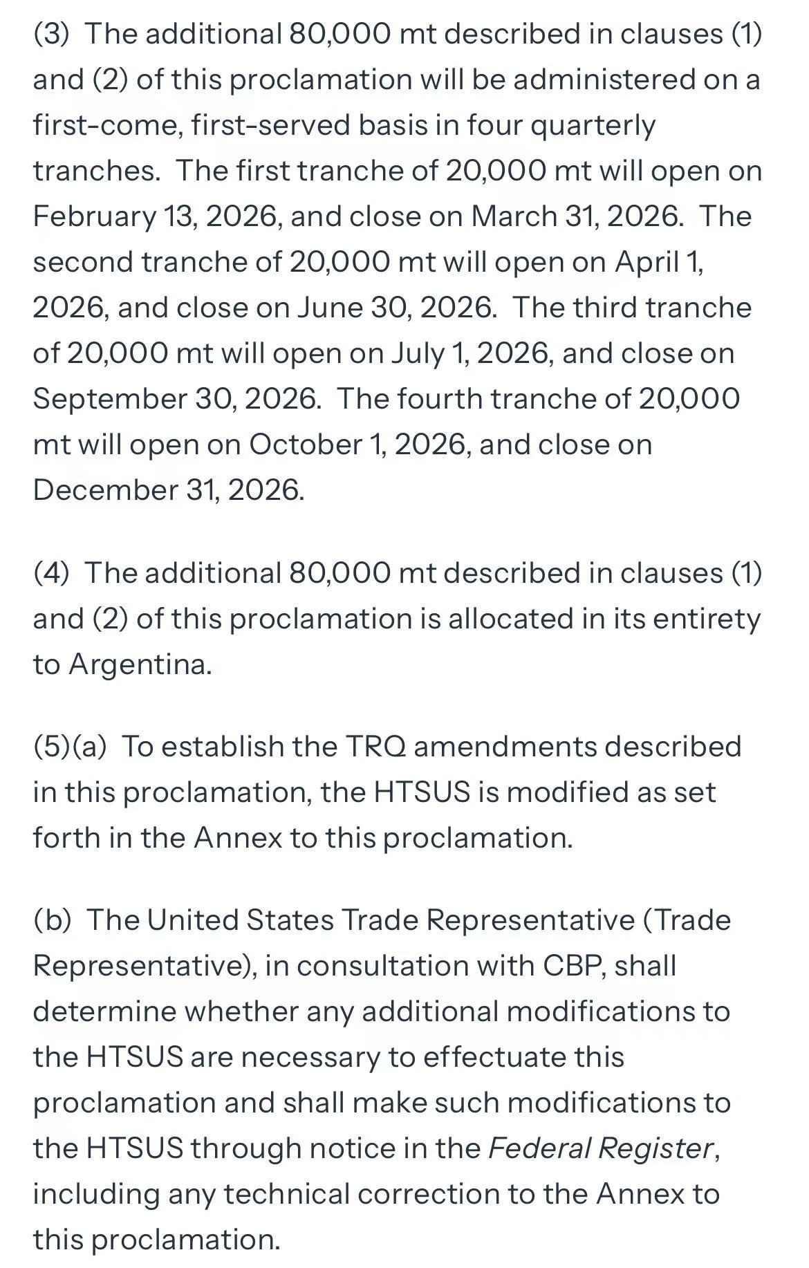 新增配额全部限定用于瘦牛肉修割料,主要用于汉堡等碎牛肉制品加工。配额将按“先到先得”原则,在2026年内分四个季度执行,首批2万吨于2月13日起开放。