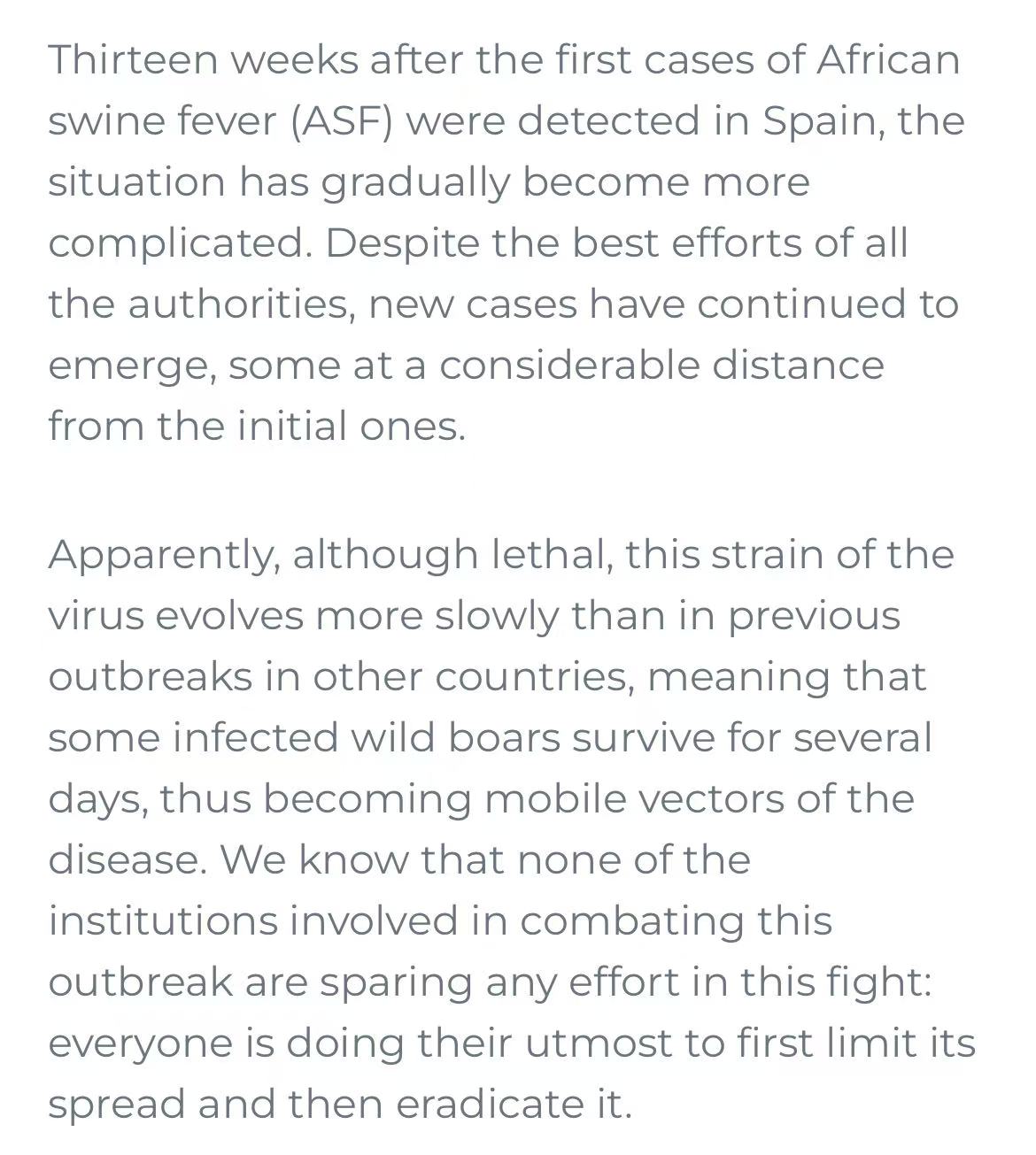距离西班牙发现非洲猪瘟已过十三周,疫情仍在扩散,新病例不断出现。好消息是这轮病毒株进化较慢,给防控留了点时间。