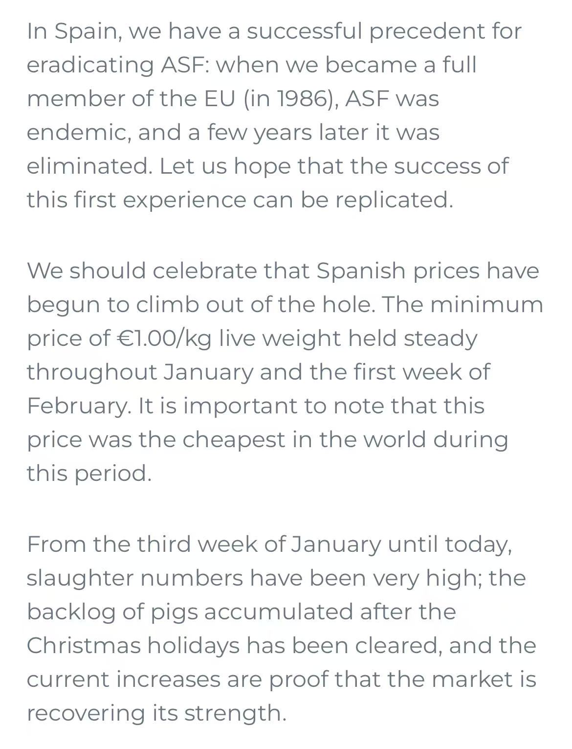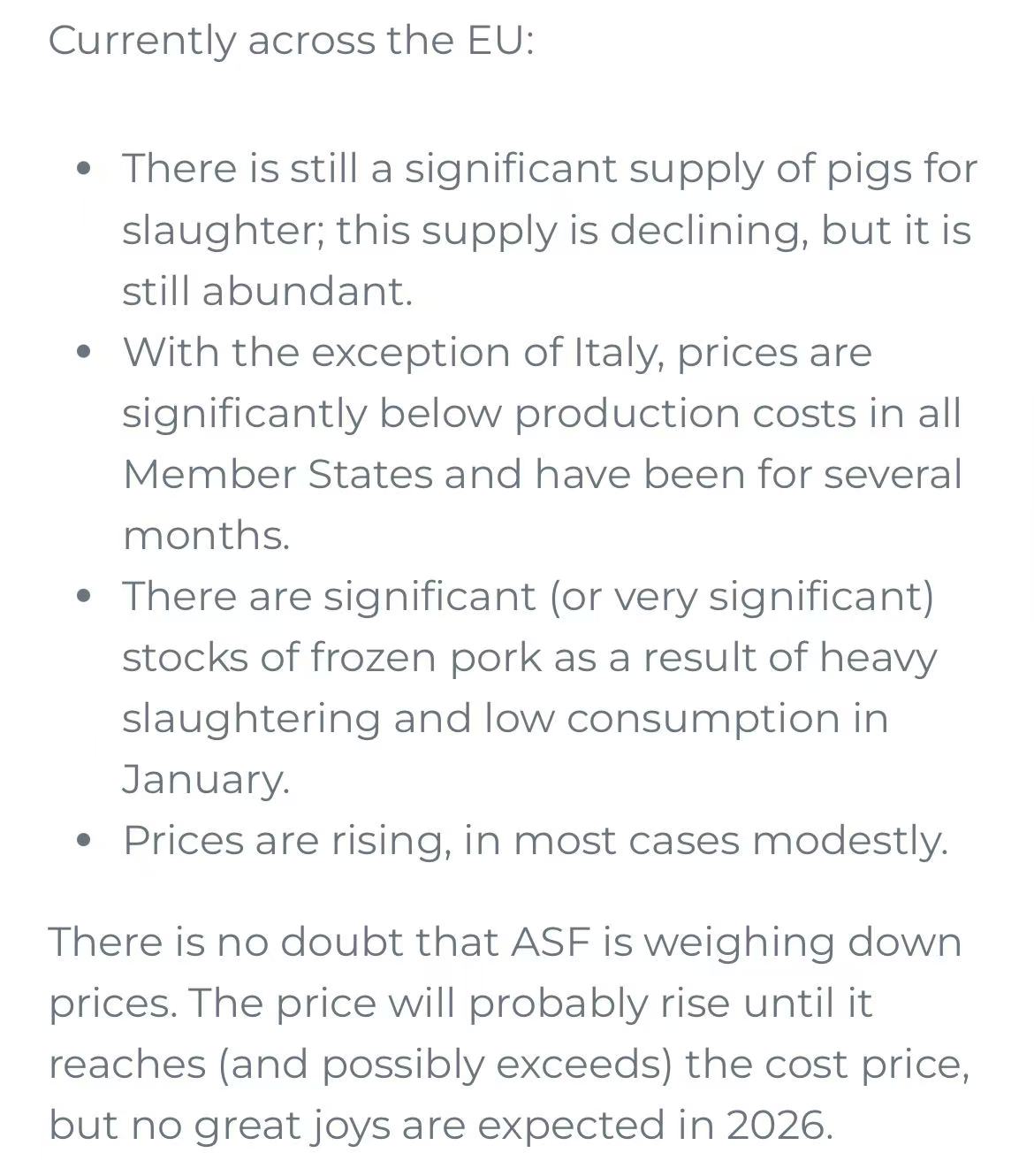 猪价开始从谷底回升:1月到2月初最低跌到1欧元/公斤,当时全球最低。节后积压生猪消化得差不多,价格慢慢往上走。